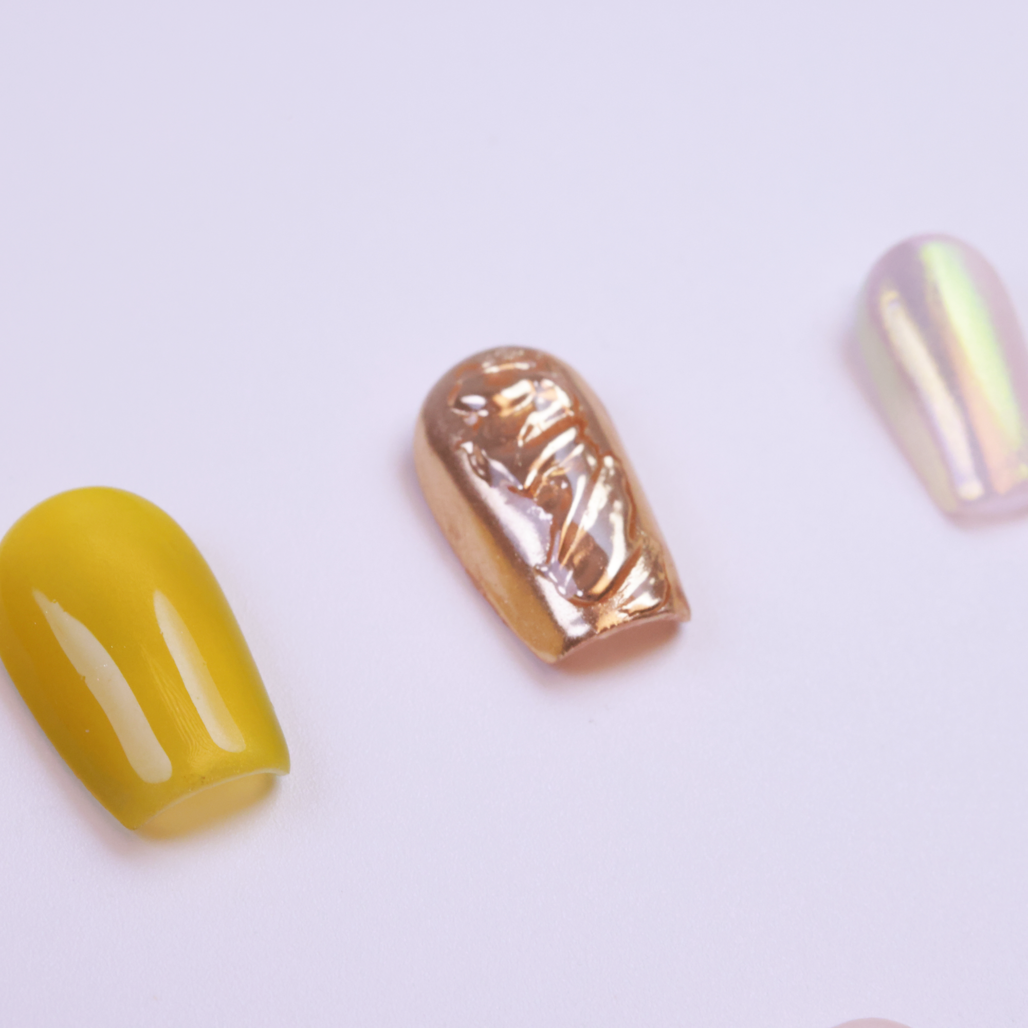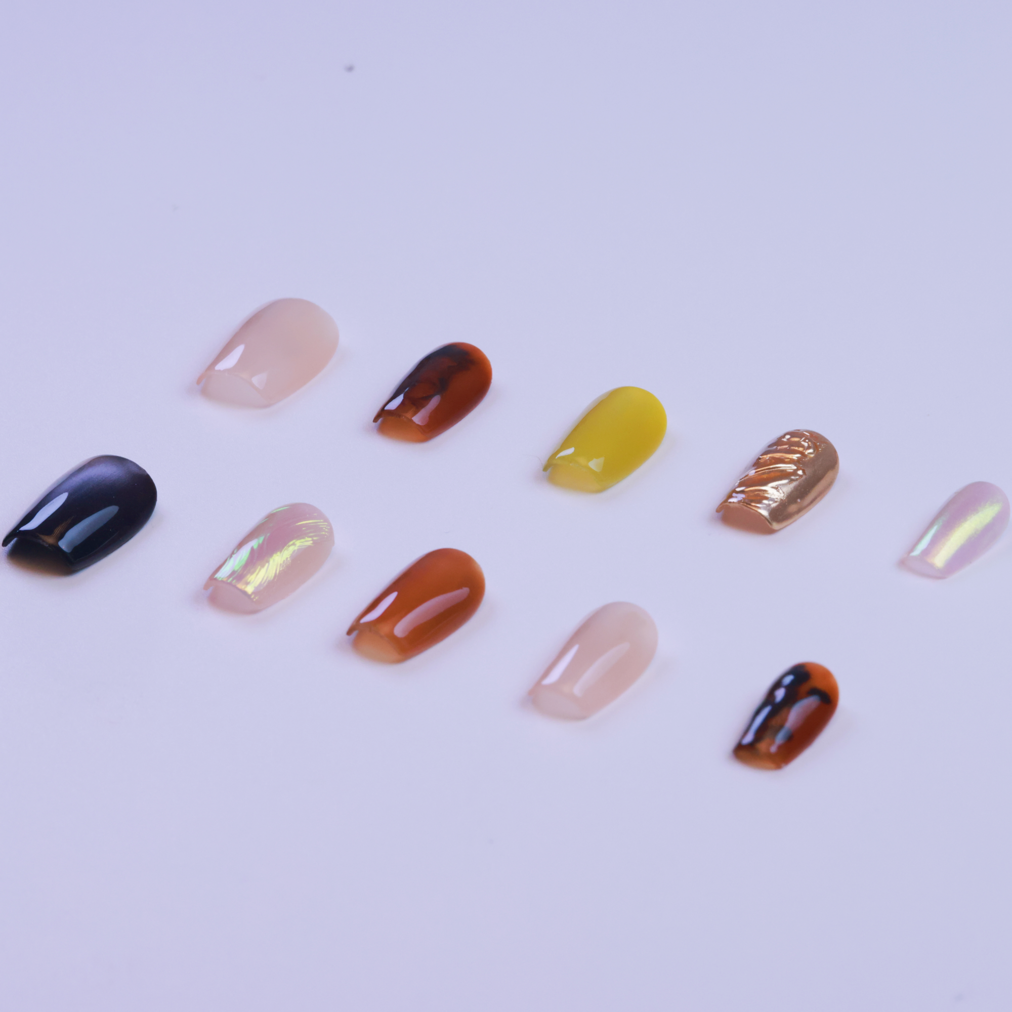 - A variety of shapes and designs, from tortoise-shell patterns to smooth, iridescent hues, making each nail unique.