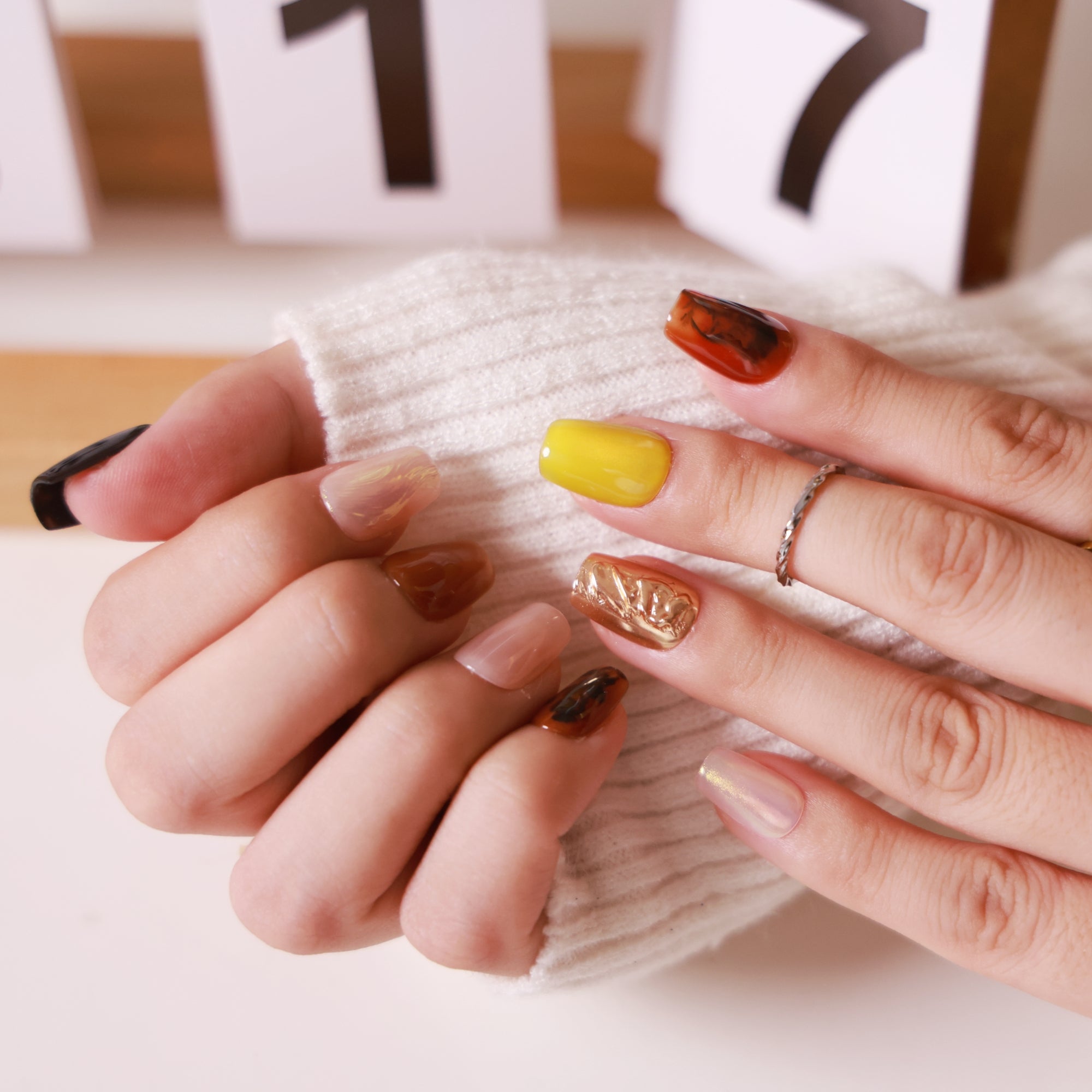Embrace the rich tones of nature with our Amber Press-On Nails. This unique set features a warm and earthy palette inspired by the golden hues of amber and natural elements. Perfect for adding a touch of sophistication to your everyday look, this set combines minimalist designs with textured accents for a balanced, stylish appeal.