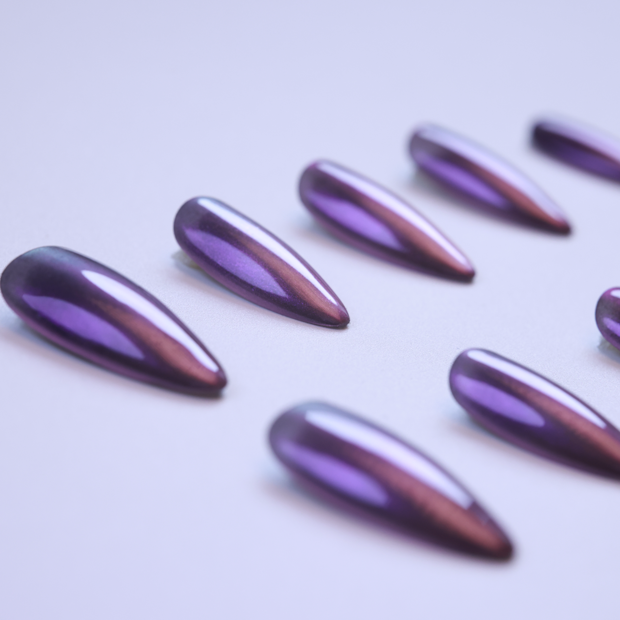 Capture the captivating beauty of amethyst with our Amethyst Gaze Press-On Nails. This stunning set features a sleek, metallic purple gradient that shifts between rich, deep hues, reflecting a soft, ethereal glow under the light. The smooth, glossy finish adds a modern and sophisticated touch, perfect for those who love a bold yet refined style.