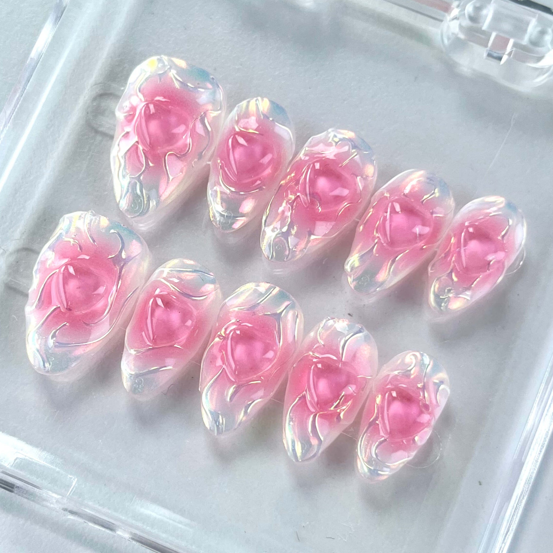 Enter a fairytale realm of luminous beauty with the Aurora Rose Press-On Nails. Featuring a translucent pearlescent base overlaid with dreamy pink 3D rose petals, this set reflects a gentle aurora-like sheen that captivates from every angle. Radiate effortless romance and elegance whether you’re on a casual date, out with friends, or attending a formal event.