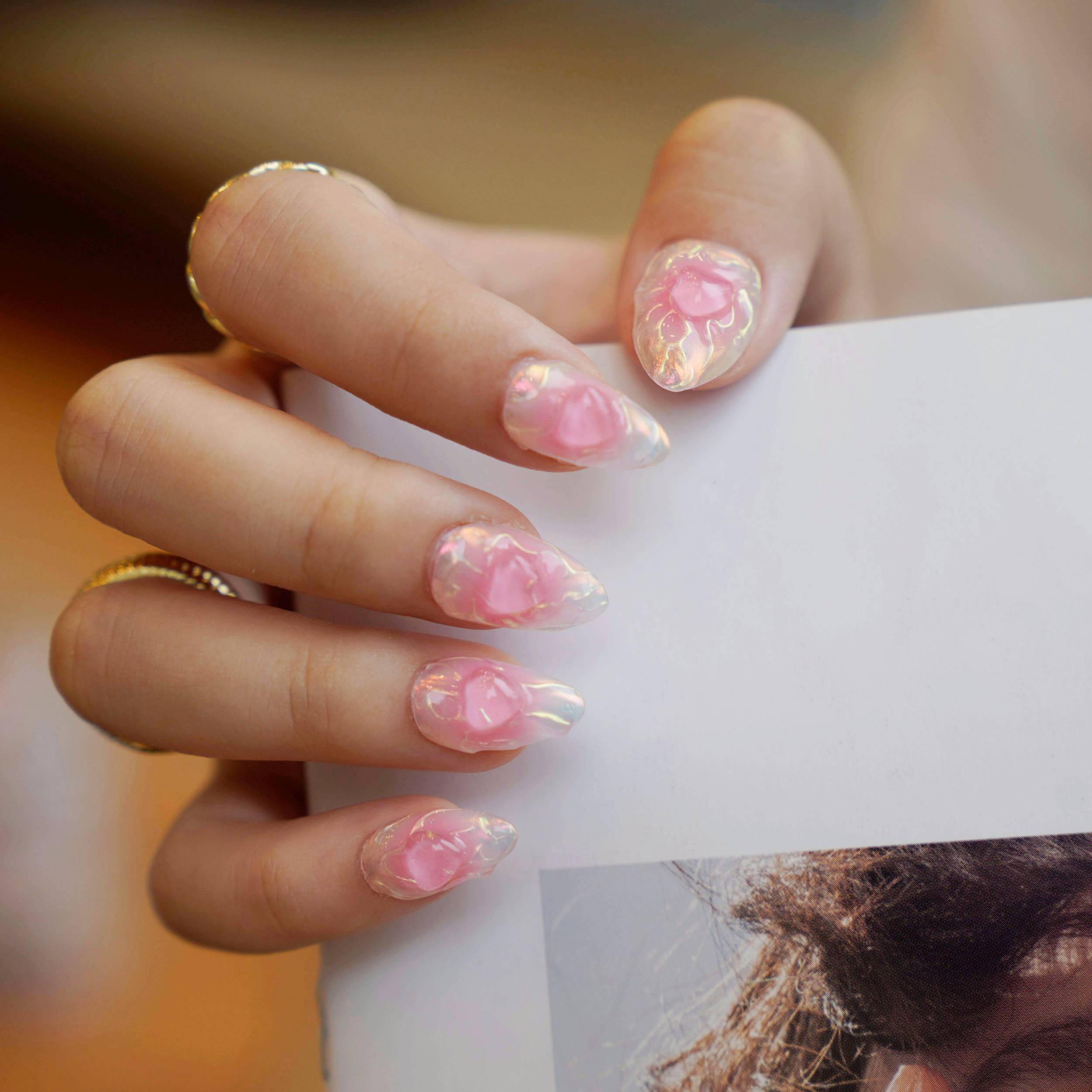 - Color & Texture: A soft, pearly translucence infused with pastel pink rose petals, creating an enchanting aurora glow