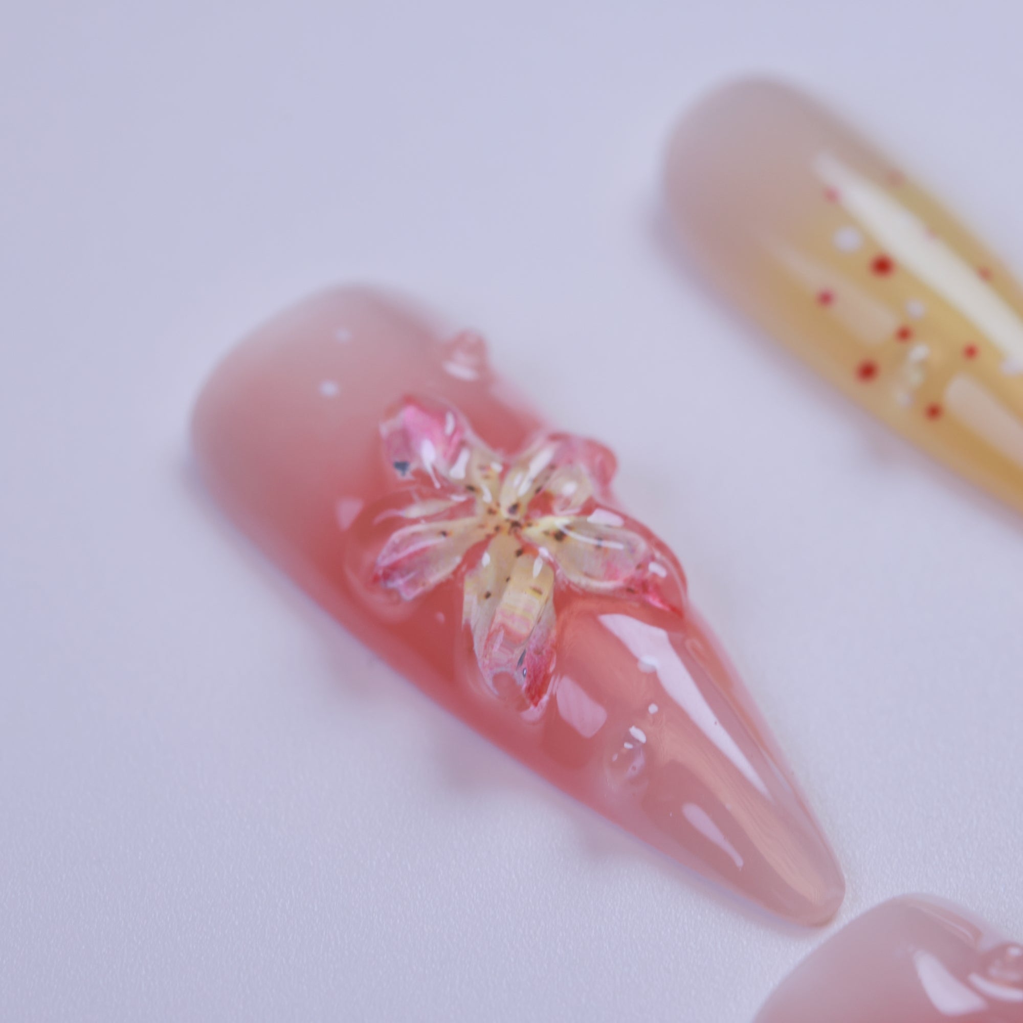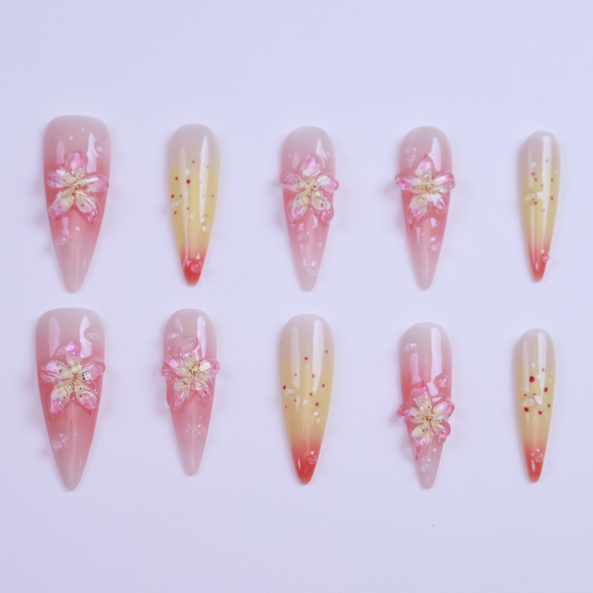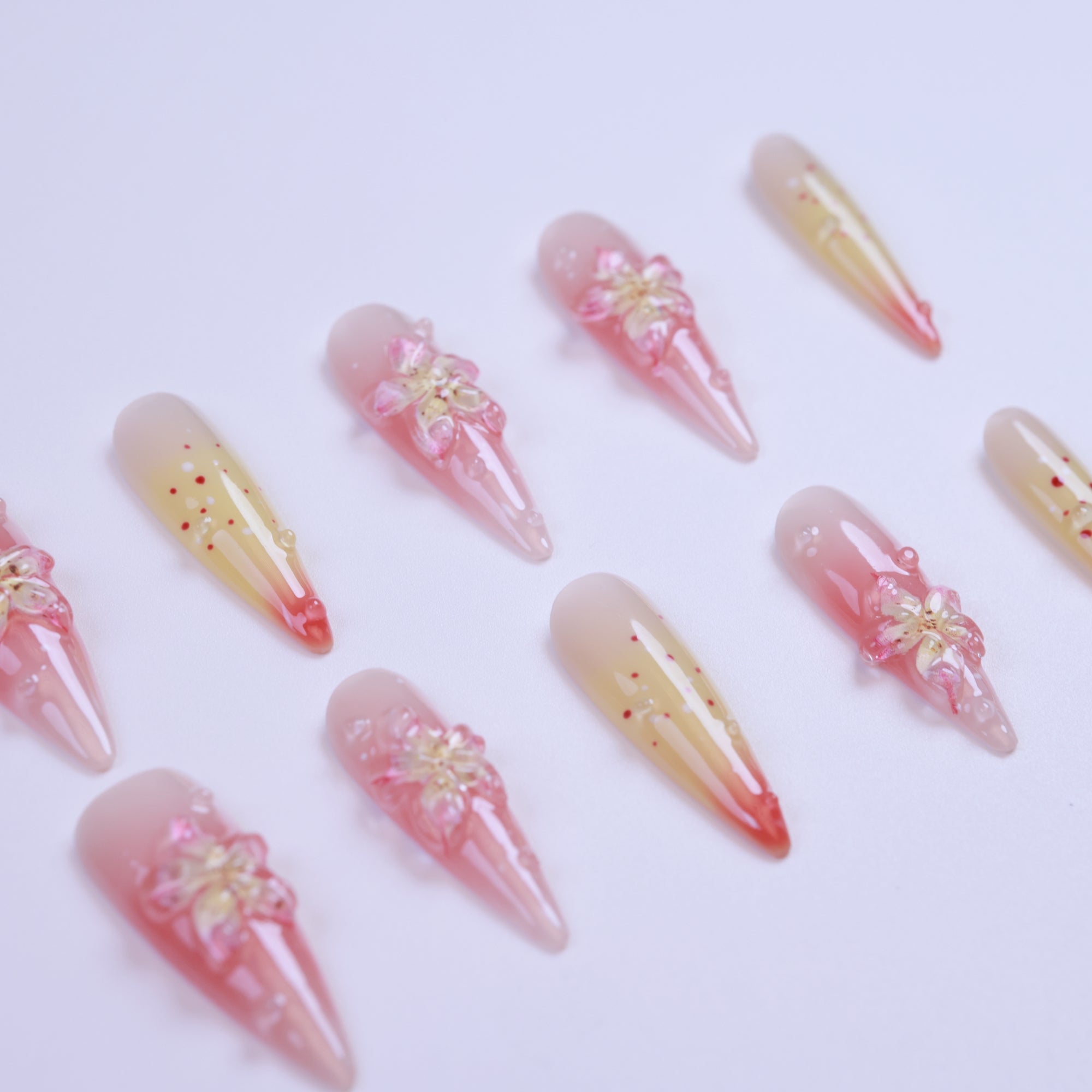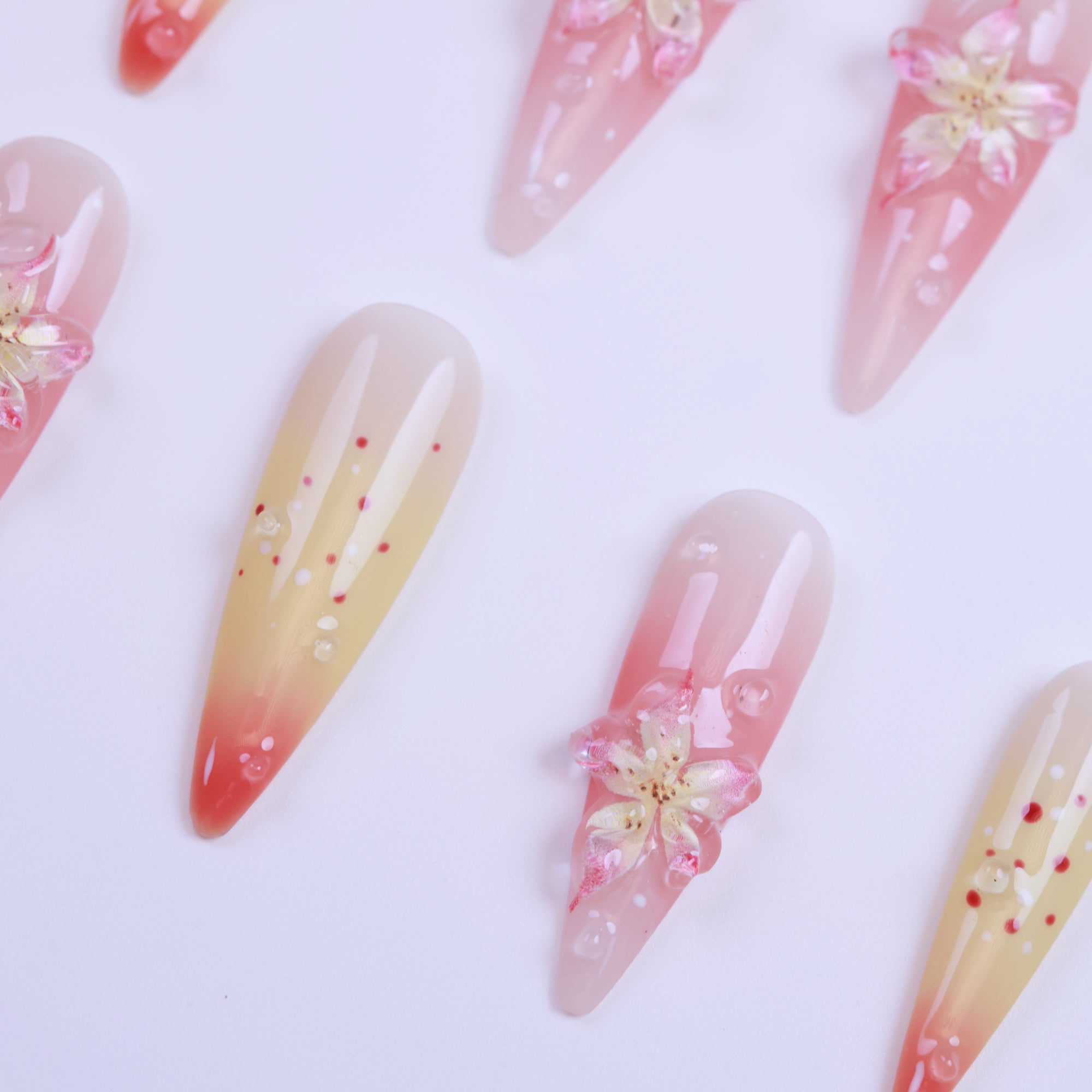 Let your nails shine with the radiant beauty of our Blossom Glow Press-On Nails. This stunning set captures the essence of blooming flowers with a graceful blend of soft pinks, warm yellows, and intricate 3D floral designs. Perfect for adding an elegant and glowing touch to your look.