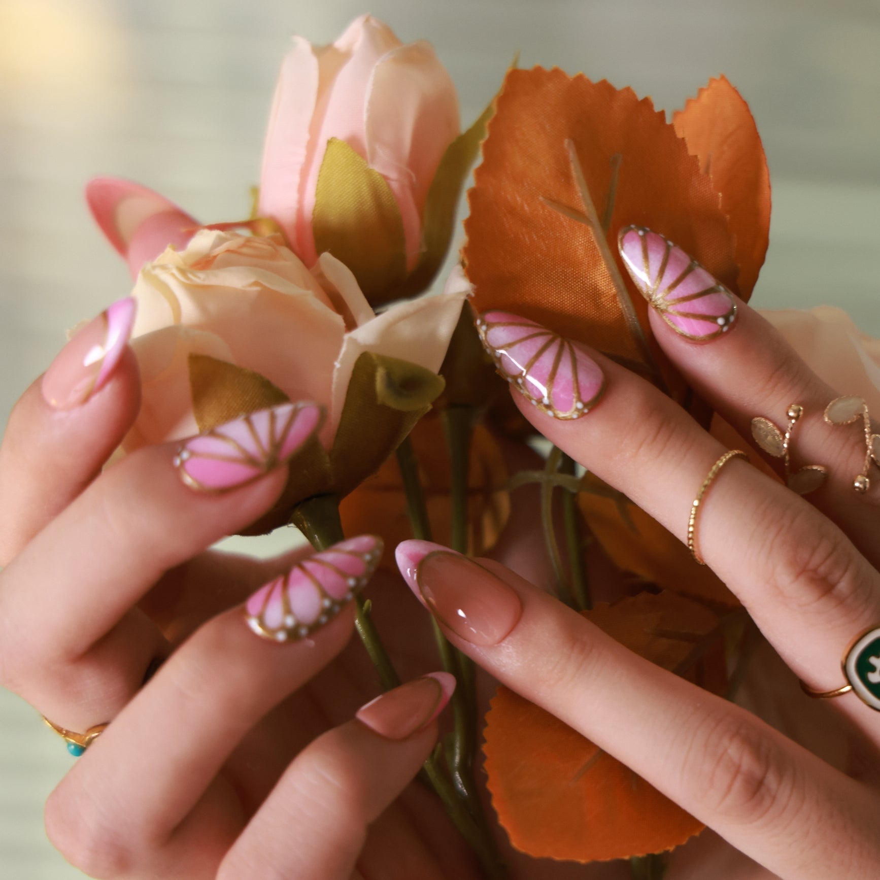 - A soft blush-pink base complemented by butterfly wing-like petal accents.
