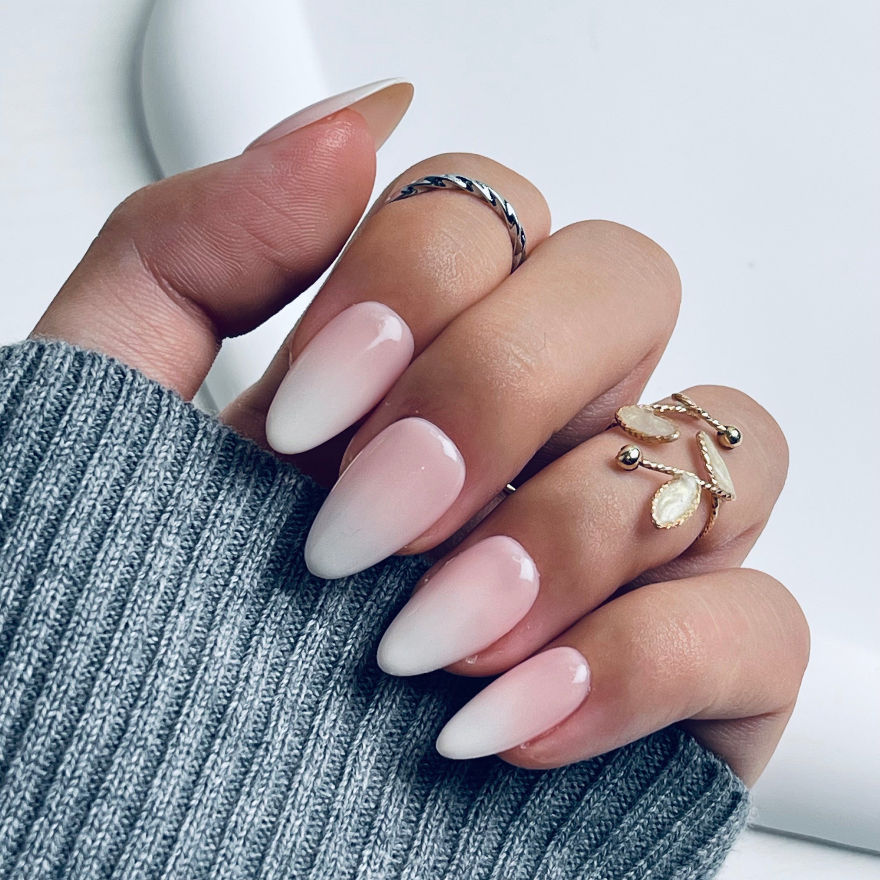 The stunning gradient from soft pink to milky white creates a beautiful ombre effect, perfect for adding a touch of sophistication to any look. Whether for everyday wear, work, or special occasions, these versatile nails complement any style seamlessly.