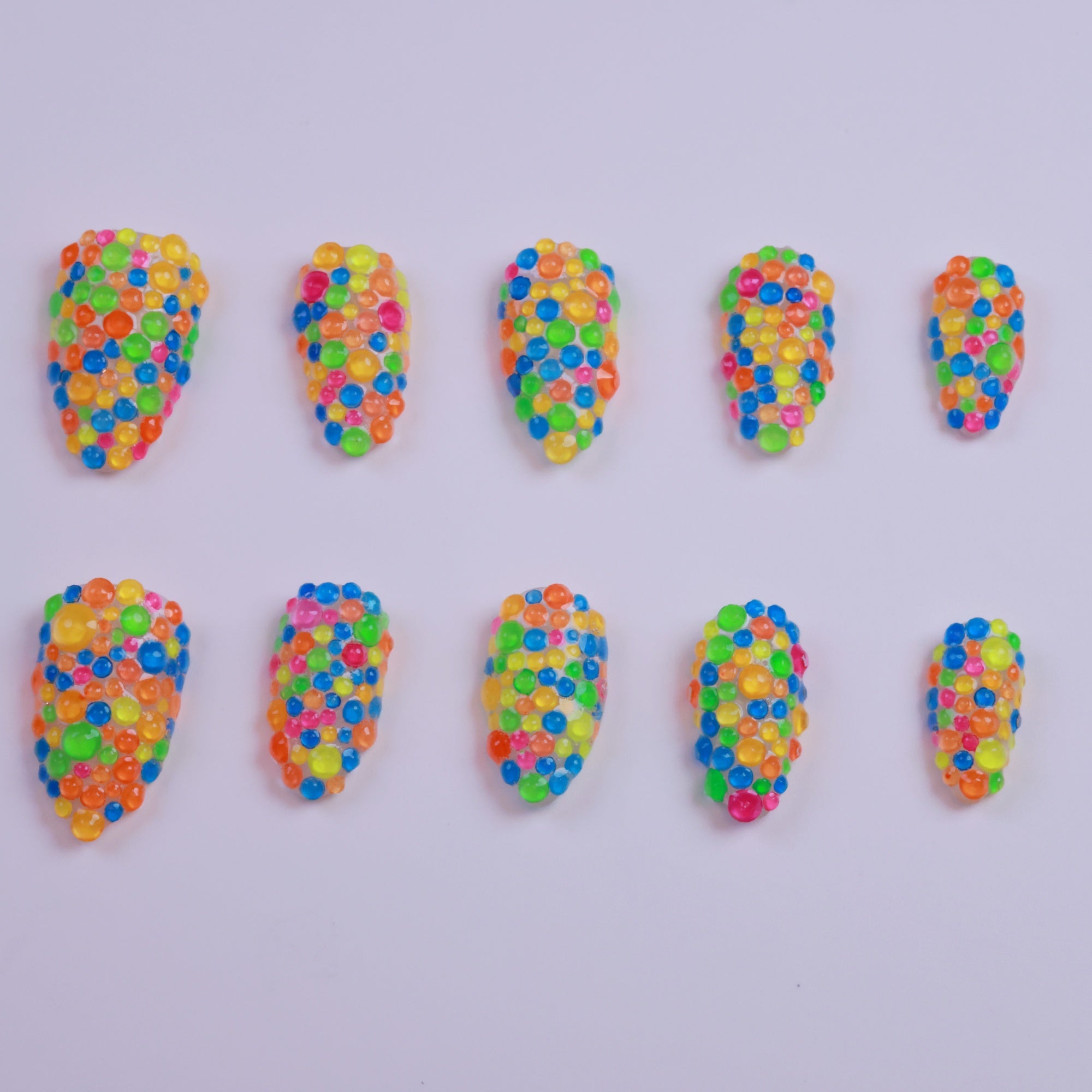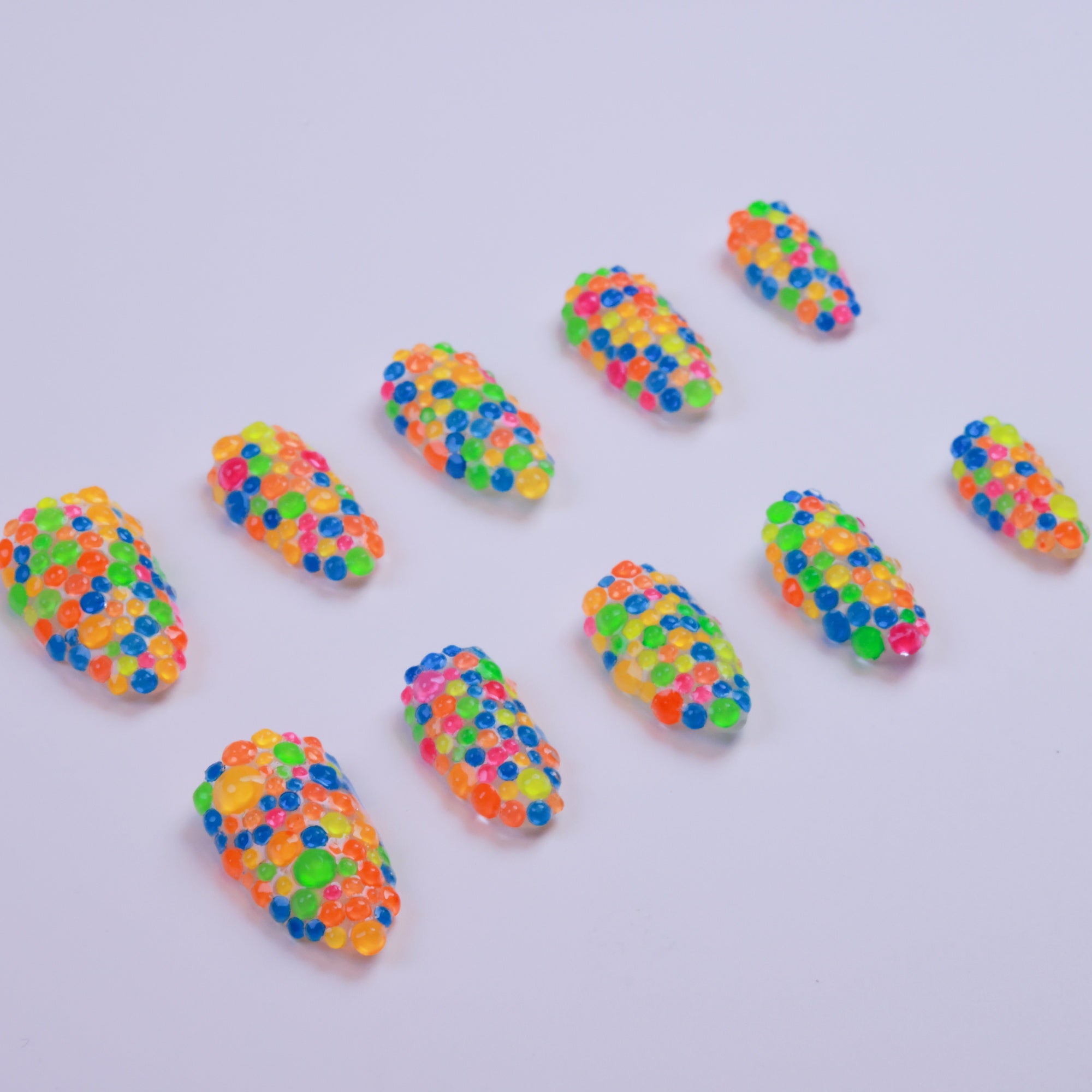 Bring a burst of color and playfulness to your nails with the Candy Crush Press-On Nails! These nails are a delightful, fun design that mimics the vibrant colors of candy, perfect for adding a whimsical touch to your style. Covered in multi-colored beads, each nail looks like a sweet treat straight from a candy store.