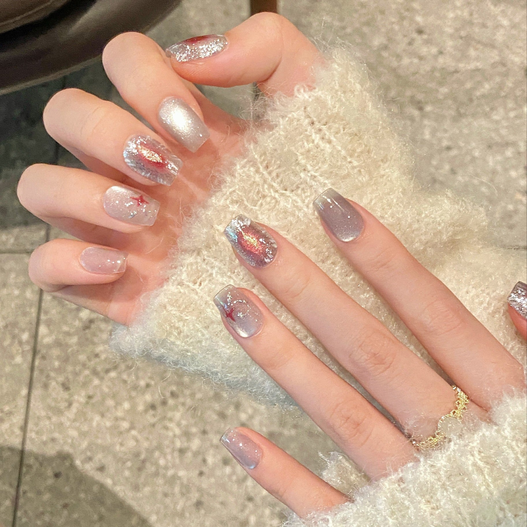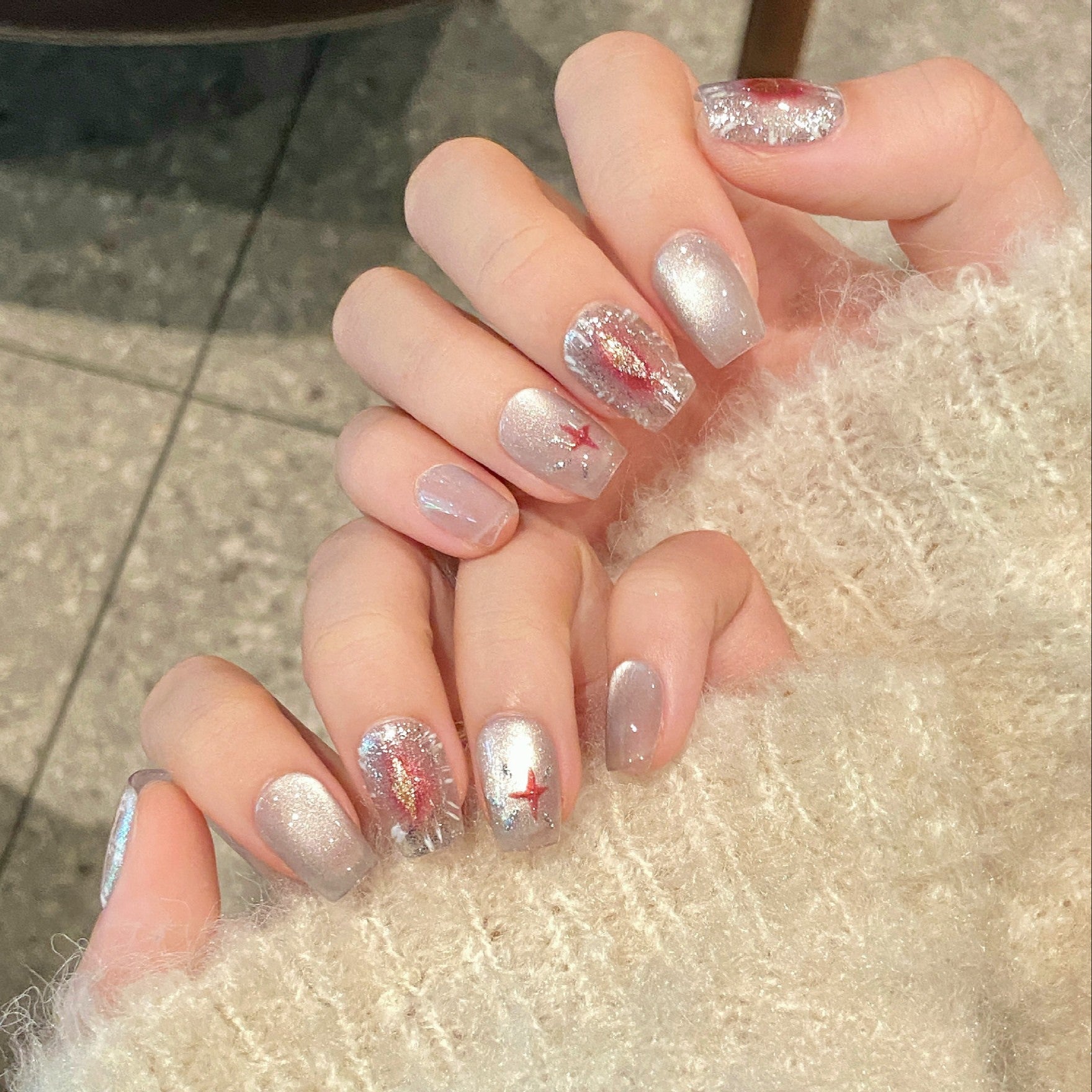Embrace a celestial vibe with the Cosmic Aurora Press-On Nails, featuring a shimmering silver base enhanced by red-pink accents and dazzling star details. Inspired by the mystique of nebulae and the brilliance of cosmic lights, these short square or oval nails are equally perfect for everyday wear and statement-making occasions.