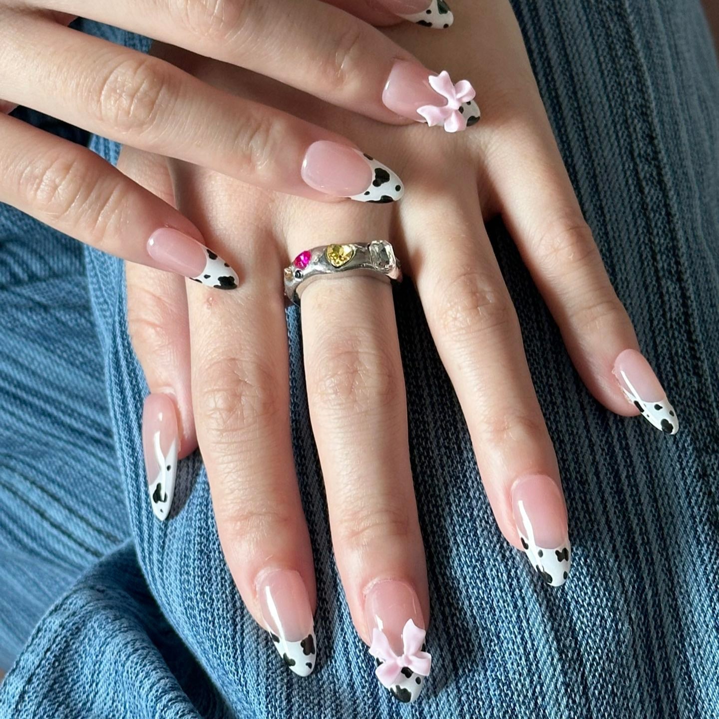 - Cow-Print Accents: A whimsical French tip design with black-and-white spots for extra cuteness