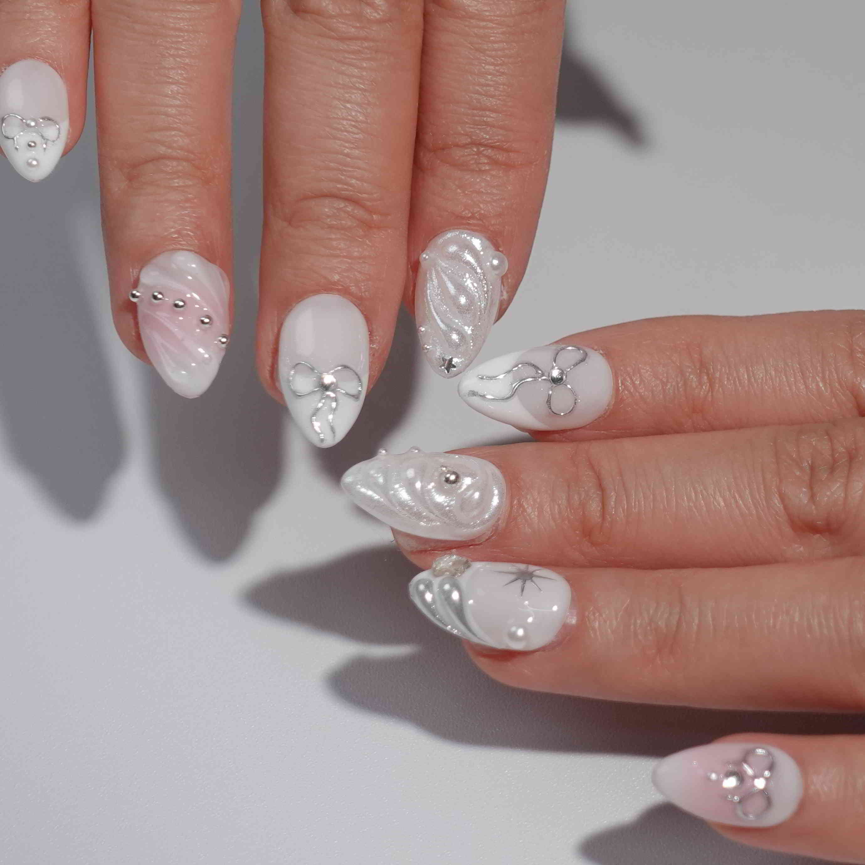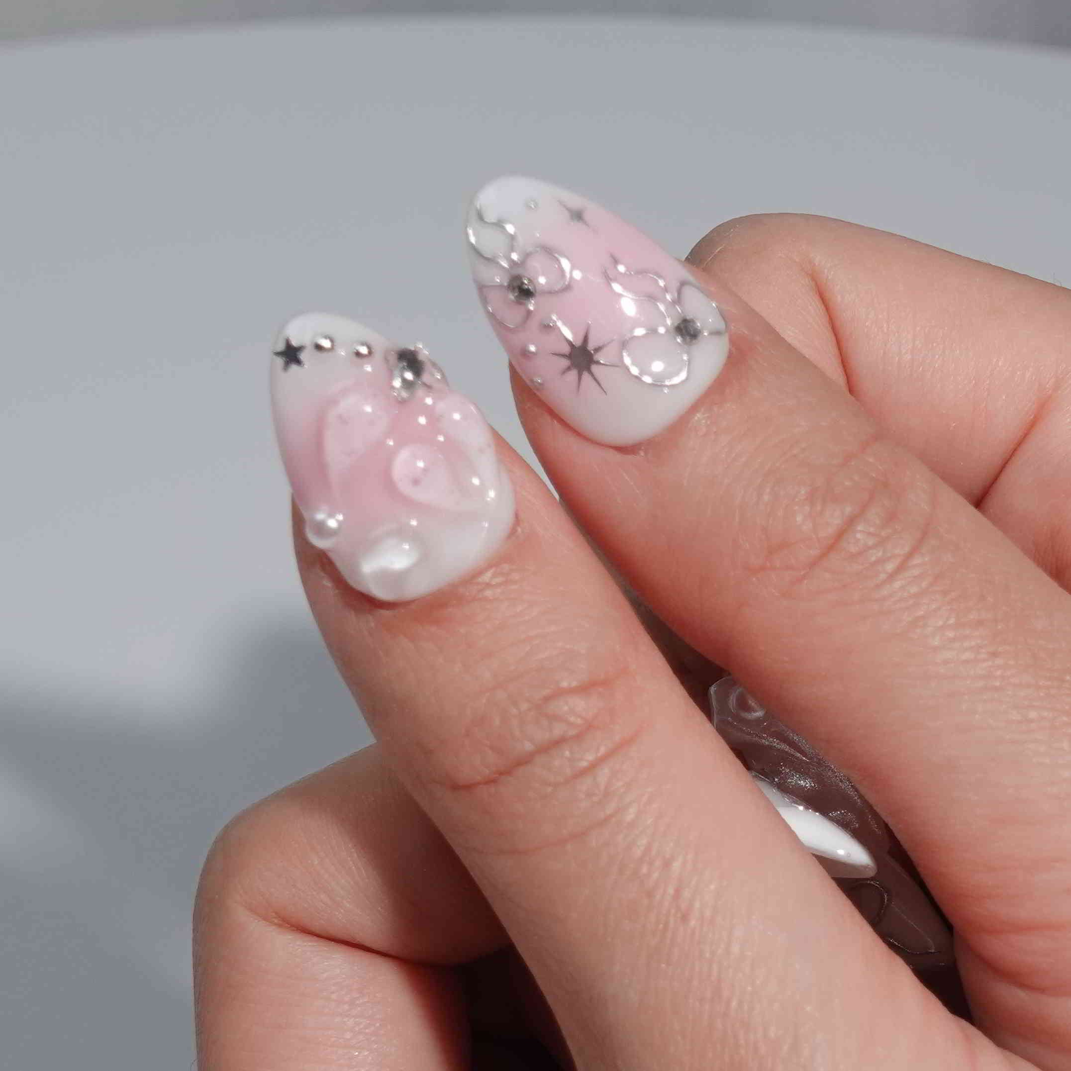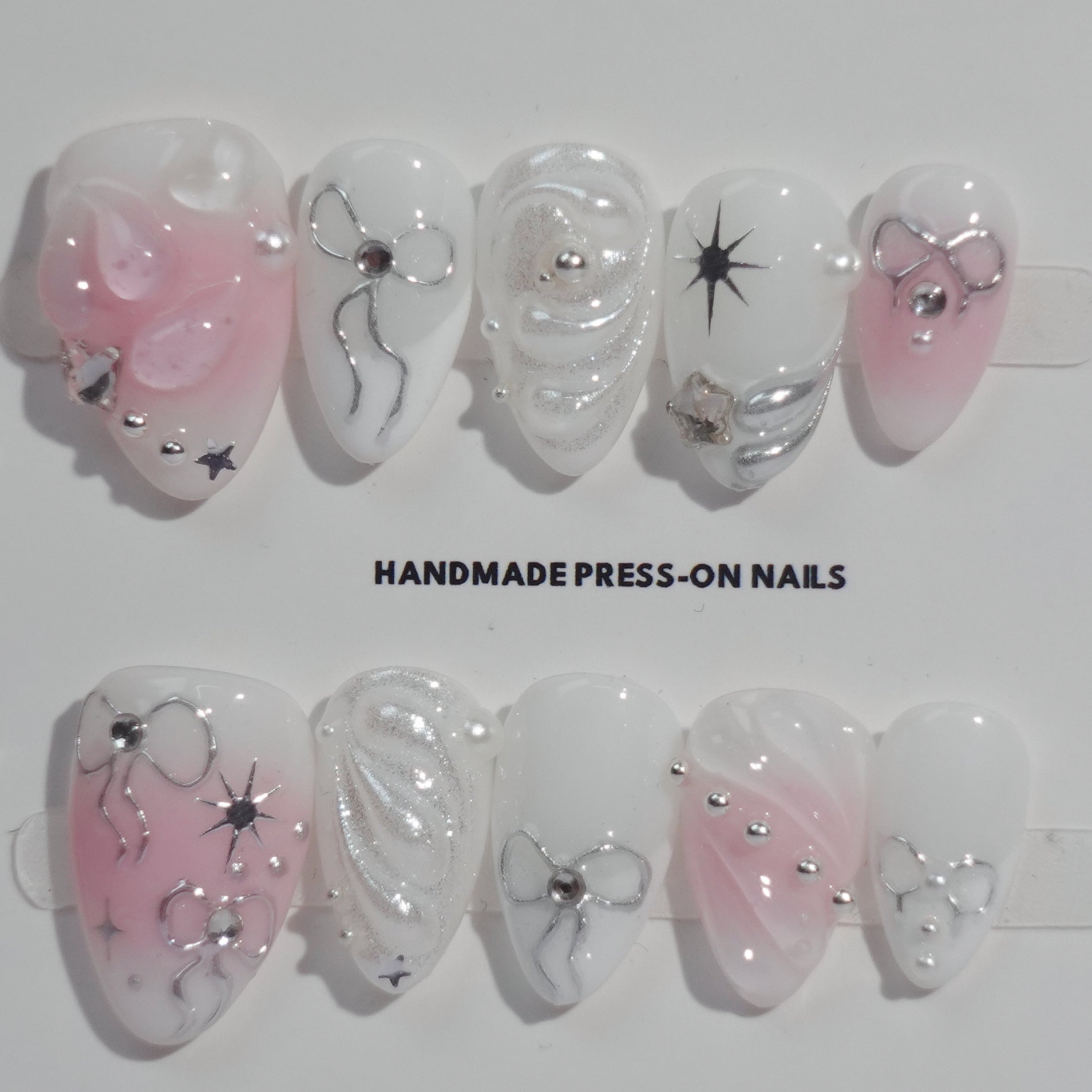 Adorn your fingertips with Dreamy Starlight, stepping into a whimsical fairytale. Featuring a soft pink and white gradient base, this design combines elegant bow accents, shimmering starlight elements, and pearl and metallic details, creating a unique blend of refinement and romance. Perfect for any occasion, these nails ensure you stand out effortlessly.