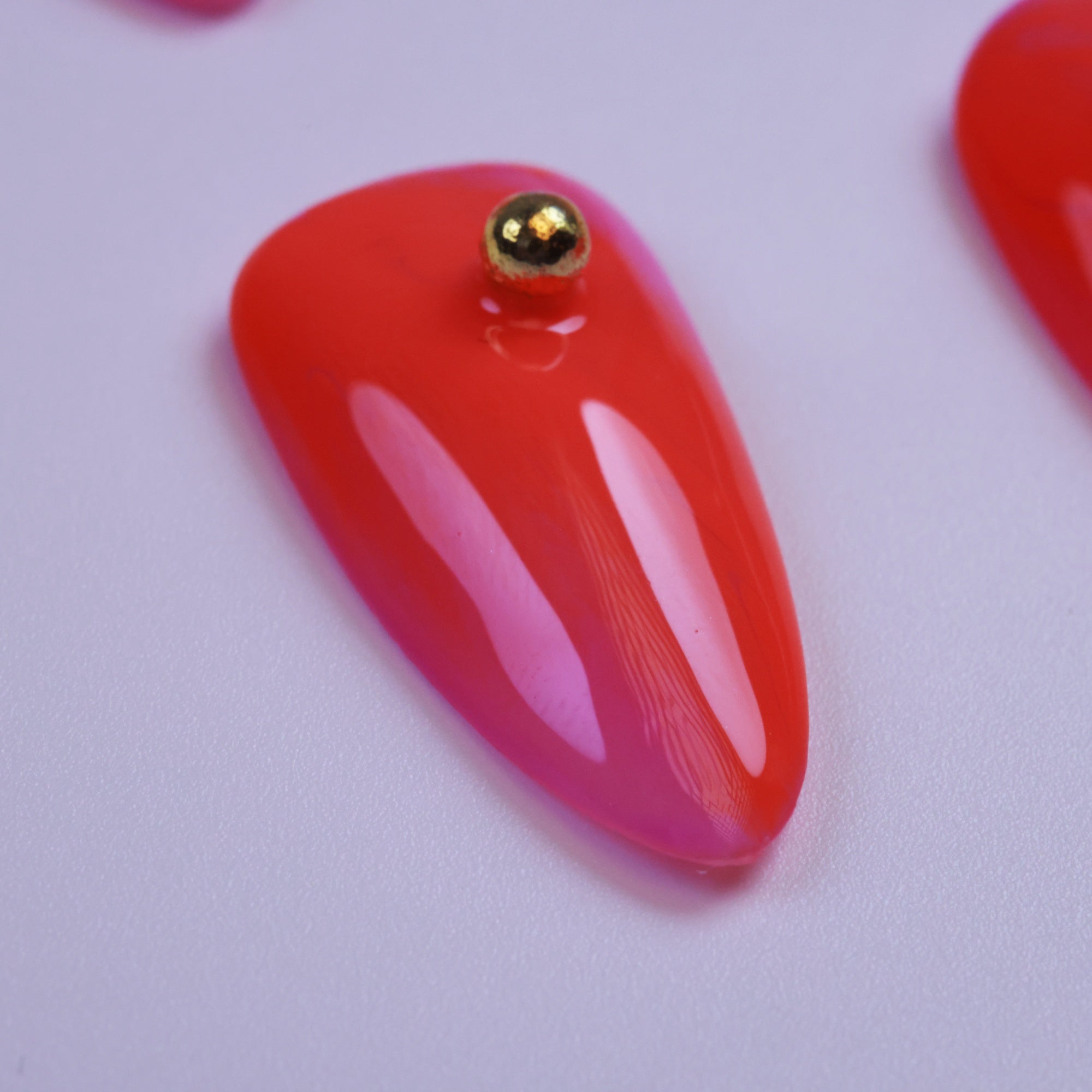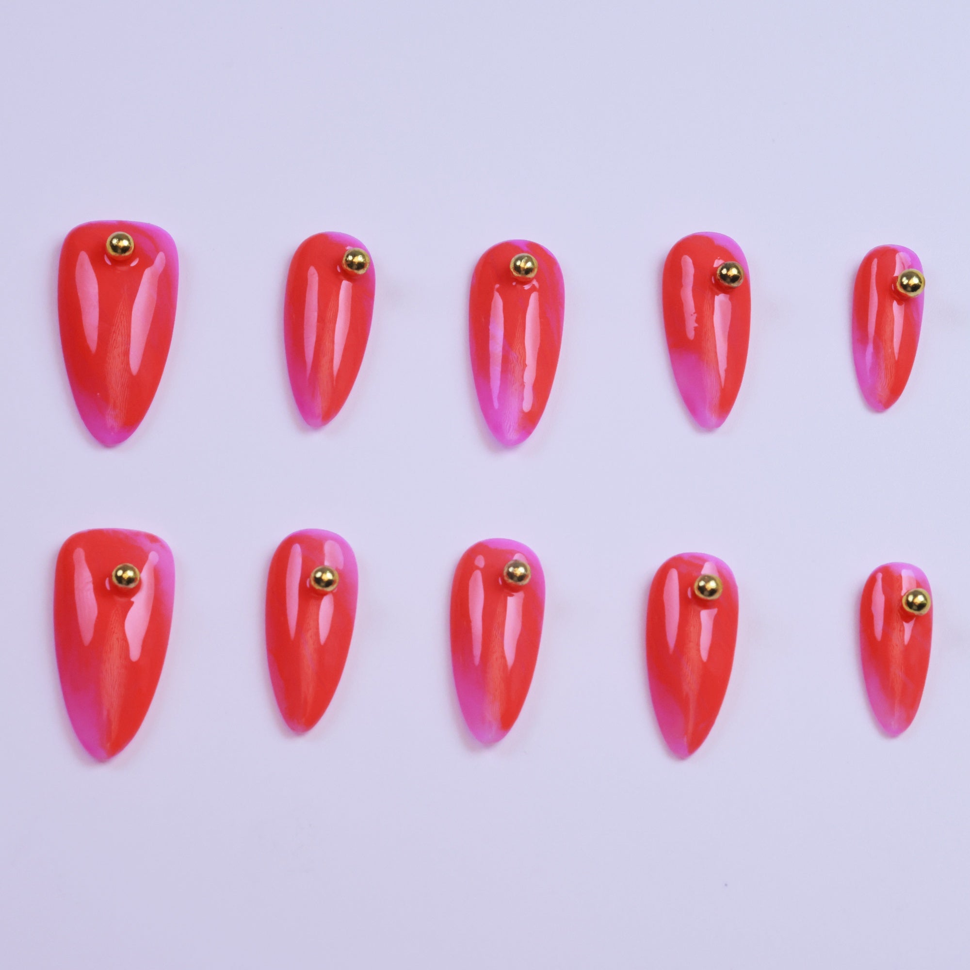 Add a pop of energy to your style with the Electric Sunset Press-On Nails, designed to capture the essence of a fiery sunset. The rich, electric pink hue is accented by a stunning metallic gold stud, bringing the perfect balance of boldness and elegance. Whether you're looking to spice up your casual look or make a statement at an event, these nails are guaranteed to turn heads.