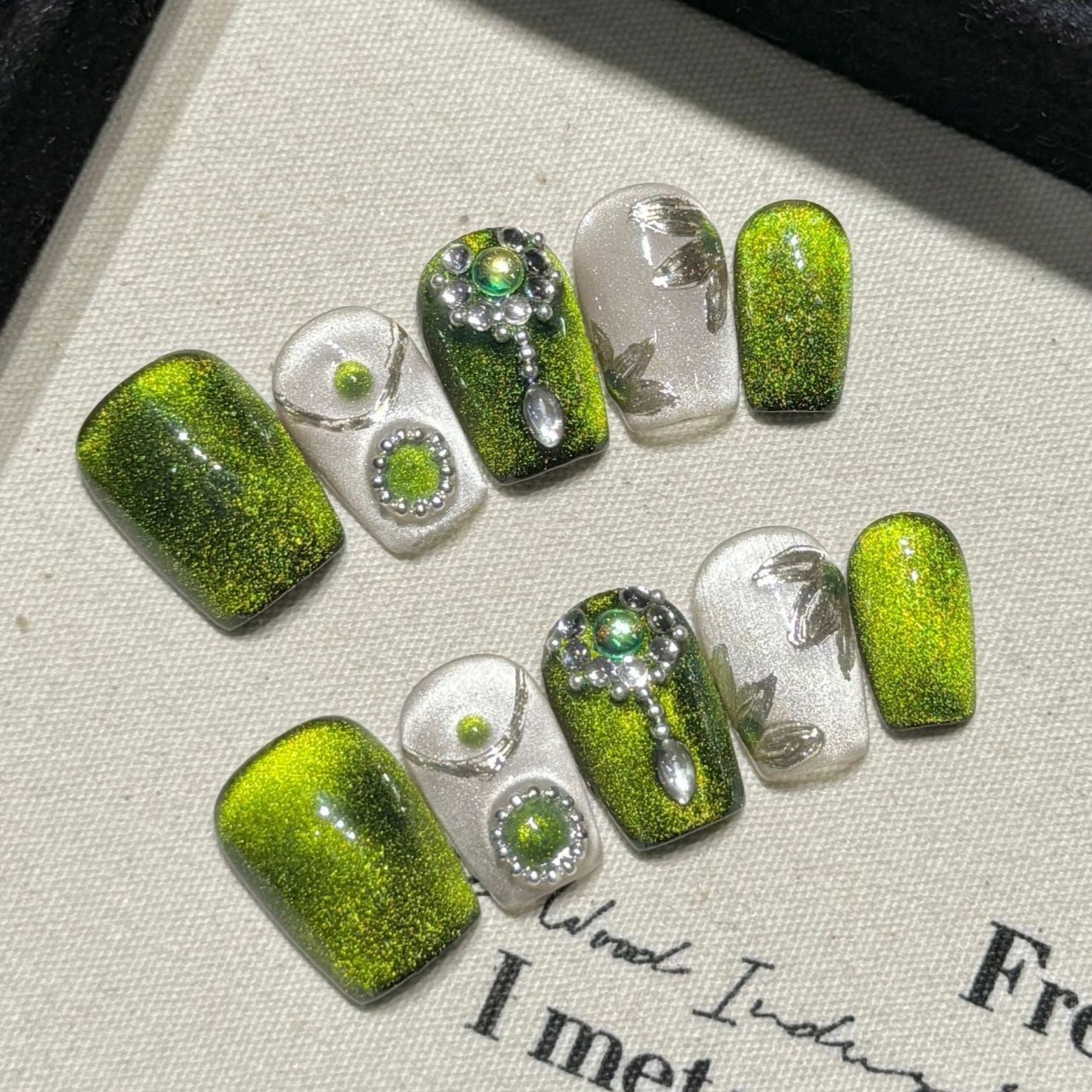 Immerse yourself in a mesmerizing fusion of metallic green hues and shimmering details with the Emerald Galaxy Press-On Nails. Like a lush cosmic forest stretching across your fingertips, these nails are adorned with gleaming rhinestones and delicate silver leaf accents for a luxurious and futuristic finish.
