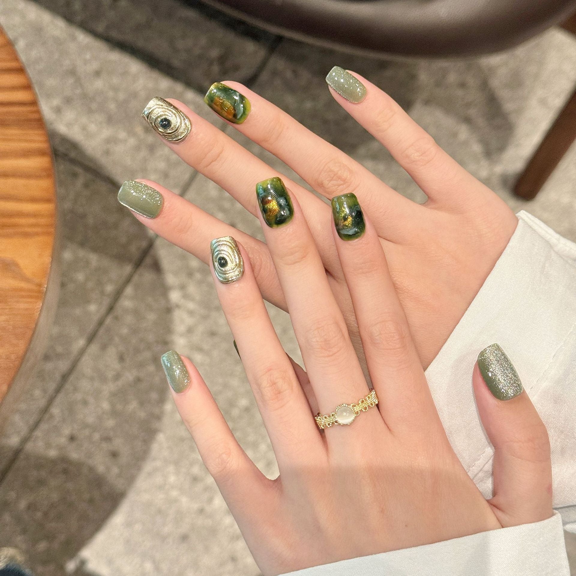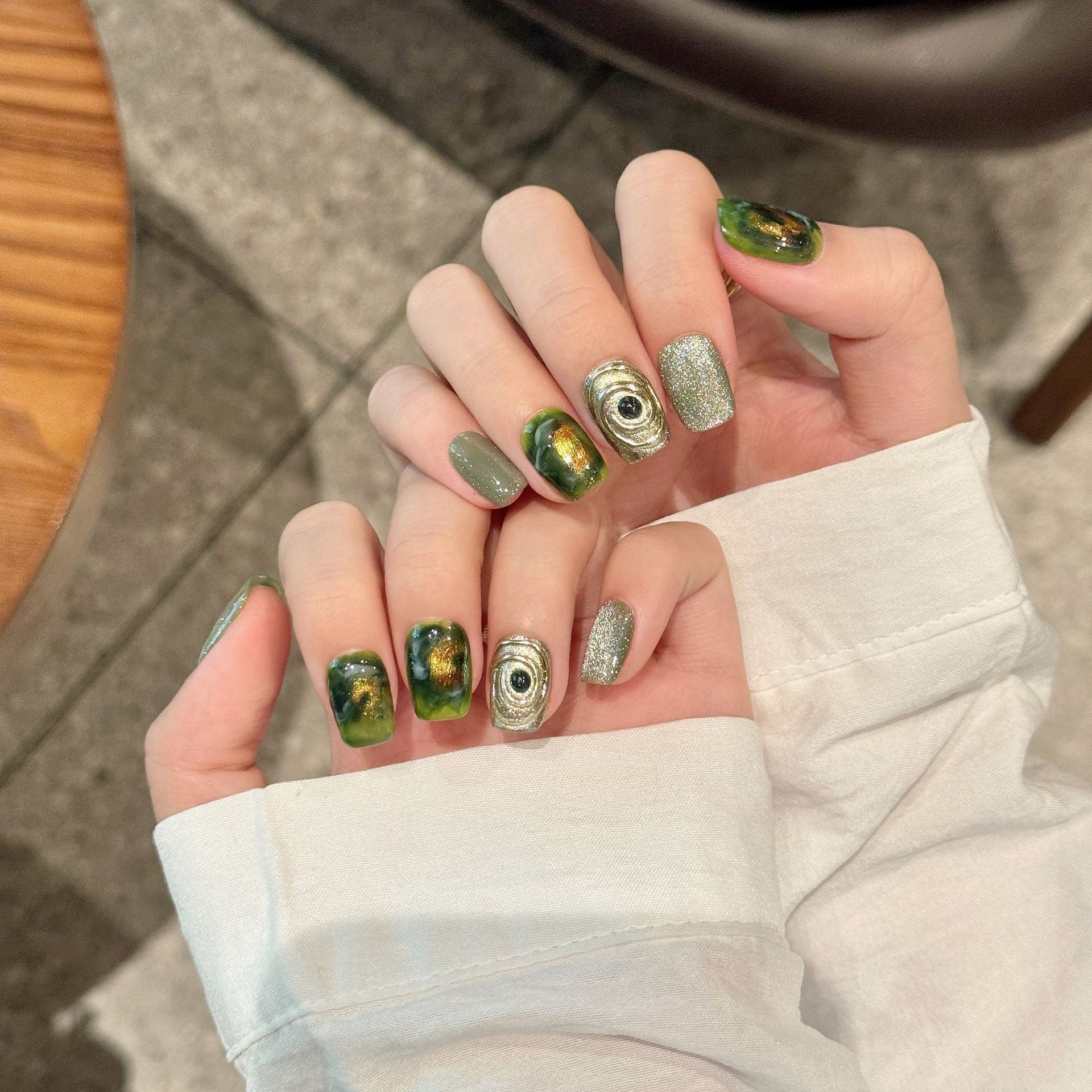 Channel the allure of both nature and cosmic wonder with the Emerald Orbit Press-On Nails. A mesmerizing blend of forest green, metallic gold, and sparkling silver creates a richly layered, galactic-inspired aesthetic. Highlighted by sculpted metallic details, these nails bring an artistic, futuristic flair to your fingertips.