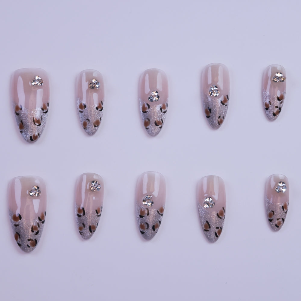 Unleash your fierce side with our Leopard French Press-On Nails. This stunning set combines the timeless elegance of French tips with a bold leopard print twist, perfect for those who want to add a bit of wild style to their look. Each nail is accented with a sparkling rhinestone for a touch of glamour, creating the perfect balance between bold and chic.