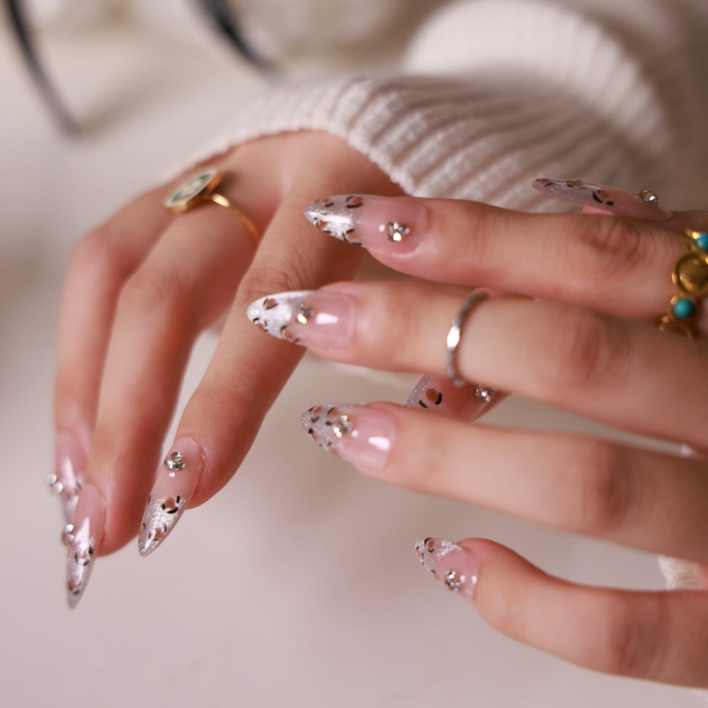 - Sleek nude and silver French tips with stylish leopard print spots, blending sophistication with a daring edge.