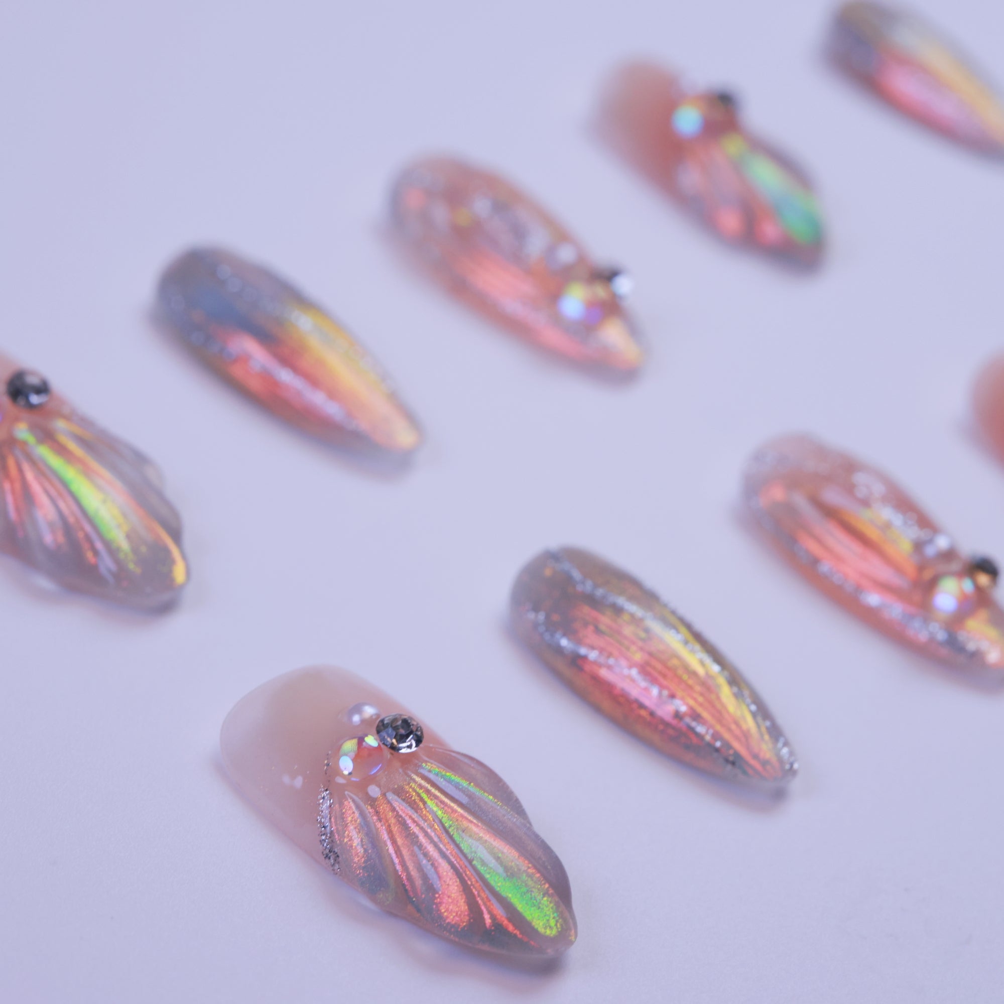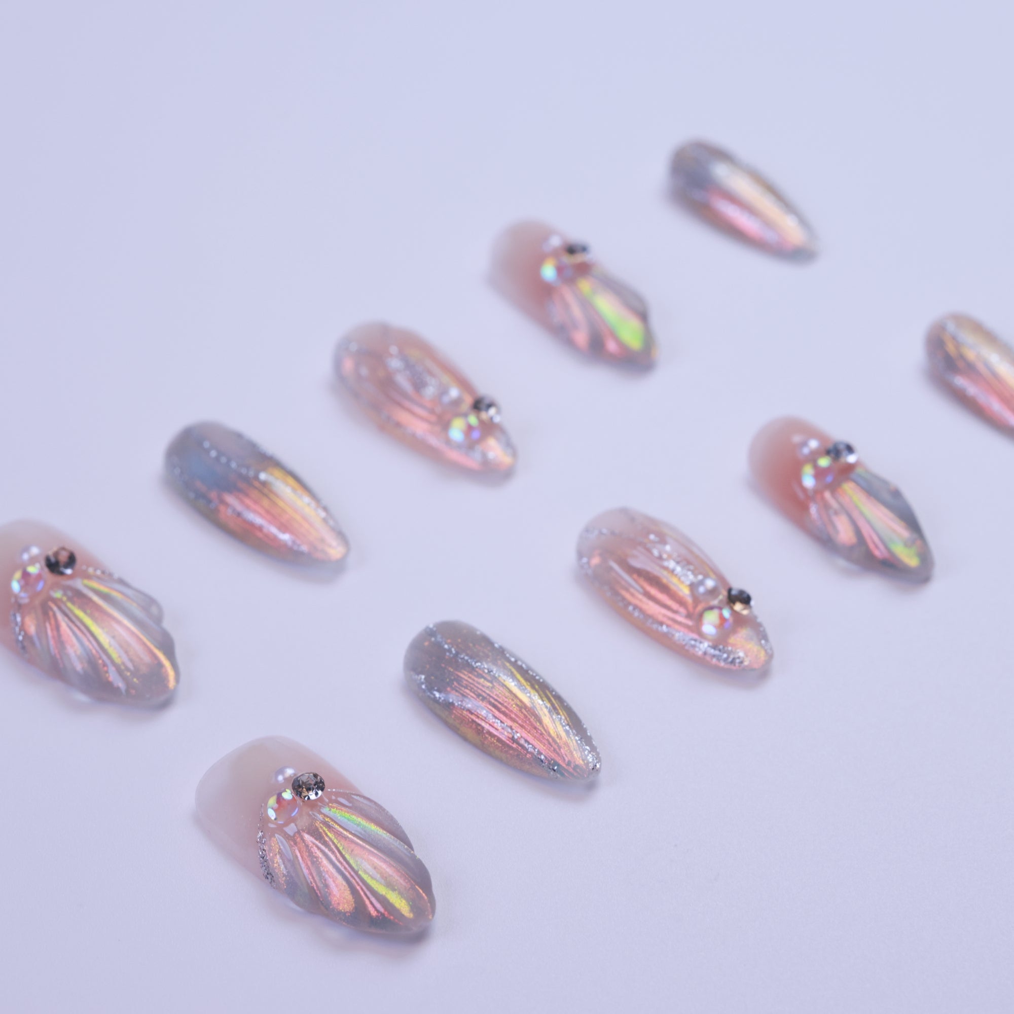Dive into the enchanting world of mermaids with our Mermaid Tears Press-On Nails. These captivating nails shimmer with an iridescent glow, reflecting different colors as they catch the light, just like the glistening tears of a mermaid under the sun.