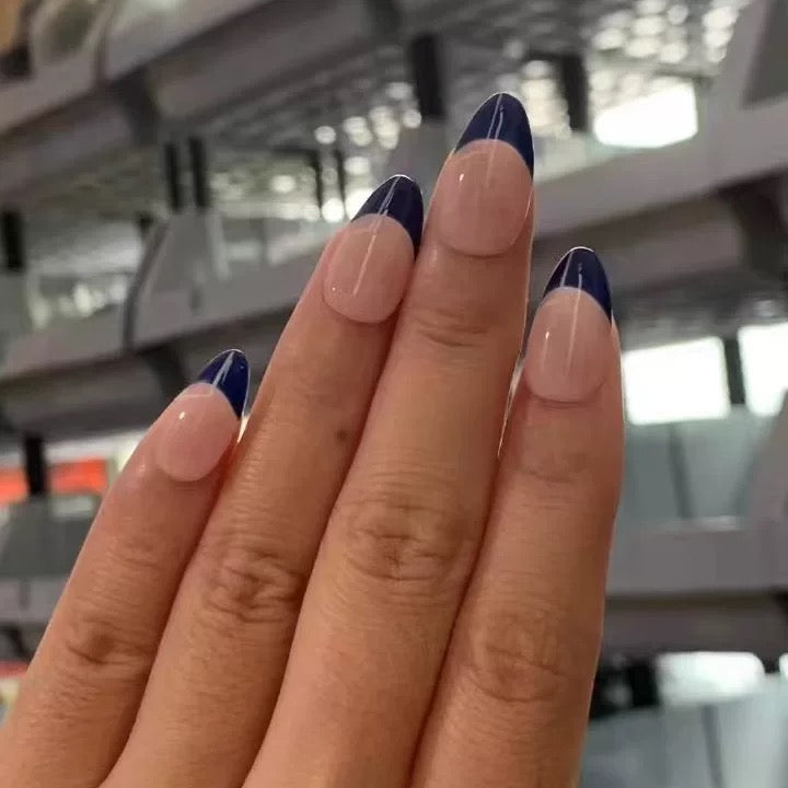 Discover the perfect balance between elegance and individuality with Midnight Blues Short Almond French Press-On Nails. This stunning set features a soft nude-pink base contrasted by a deep navy French tip, accentuated by a sleek line that defines the stylish French outline. The short almond shape not only enhances your hand’s natural beauty but also adds a refined, modern touch.