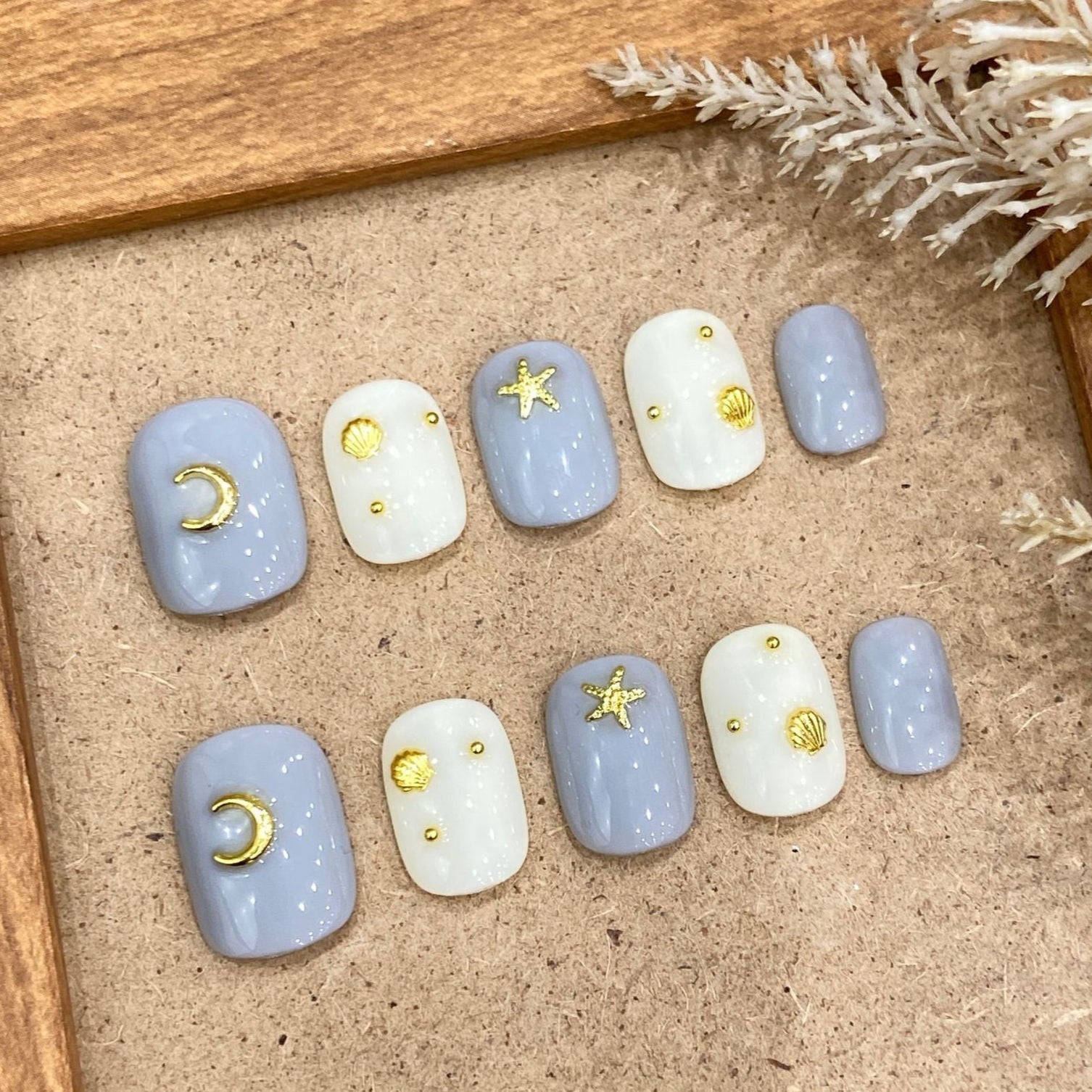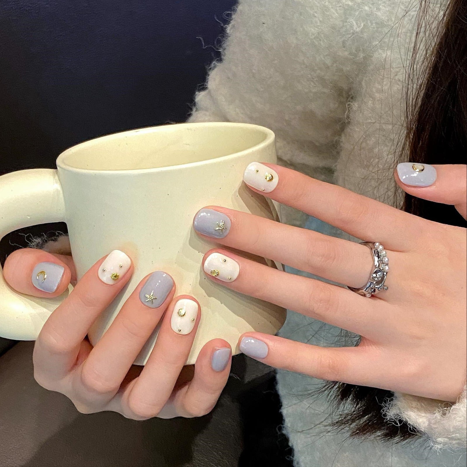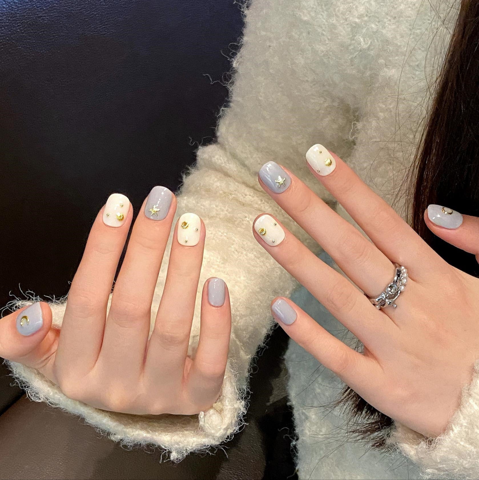 Capture the gentle hush of a winter evening with the Moonlit Frost Short Square Press-On Nails. Soft gray and warm white create a soothing color palette, while gold stars, moons, and stud accents add a touch of celestial charm. The short square shape ensures a comfortable fit for daily wear or special events, seamlessly blending practicality with understated elegance.