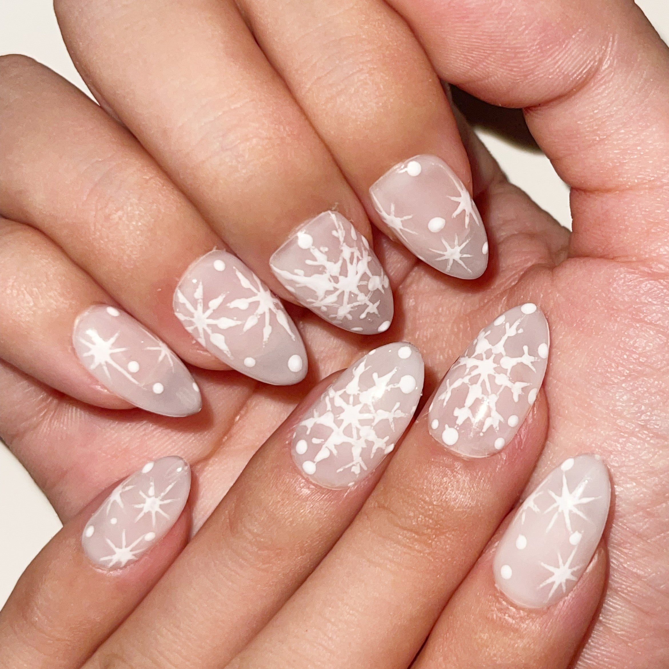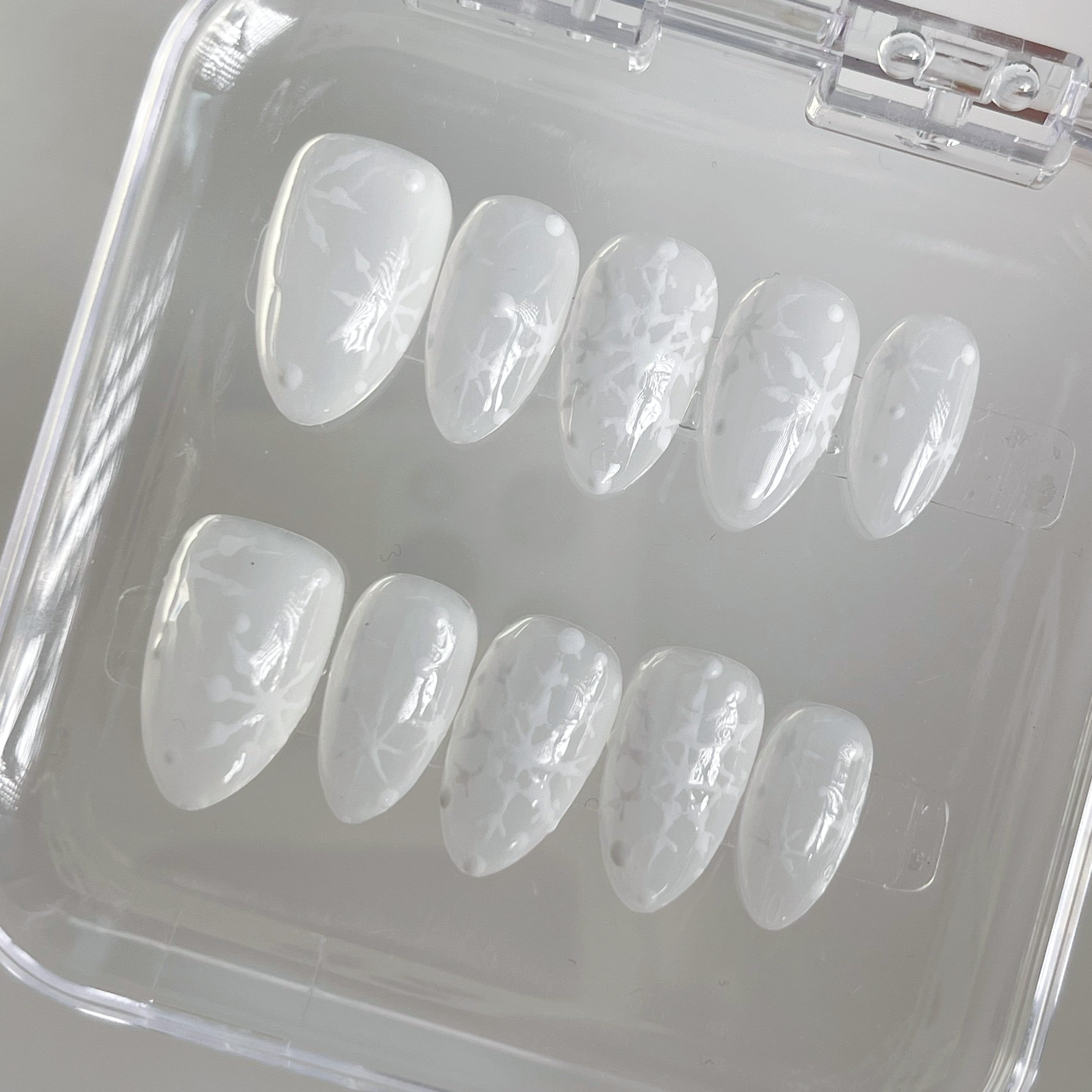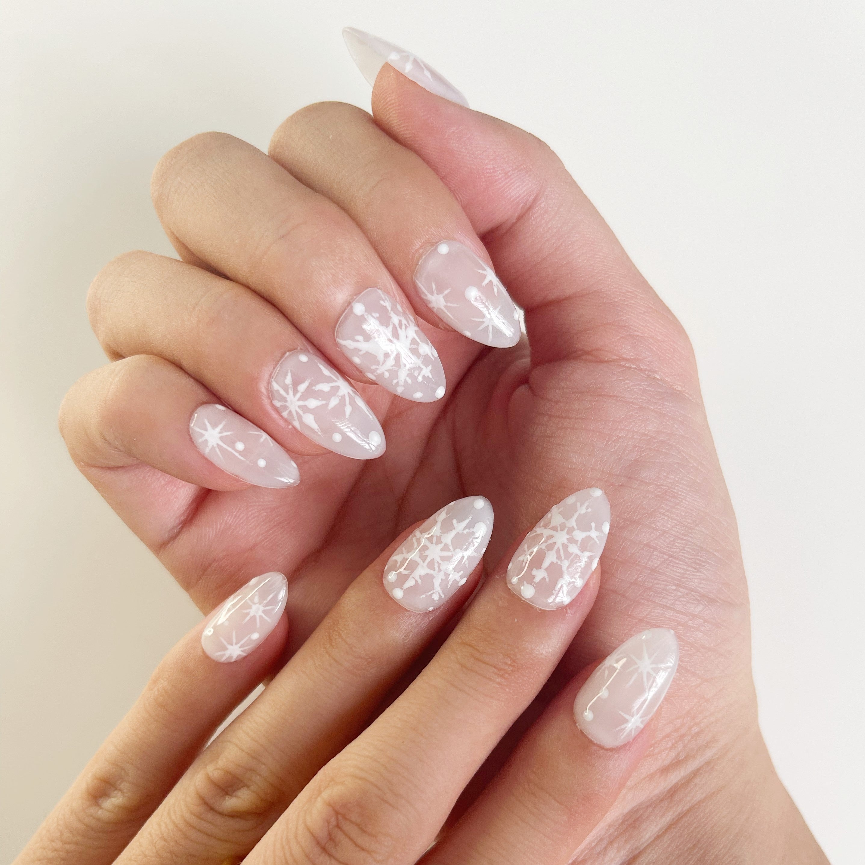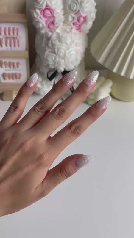 The pristine white base is beautifully embellished with intricate snowflake patterns, capturing the serene beauty of a winter wonderland. Each snowflake is meticulously crafted to add a delicate and romantic flair to your nails, making them perfect for any occasion—from everyday elegance to festive celebrations.