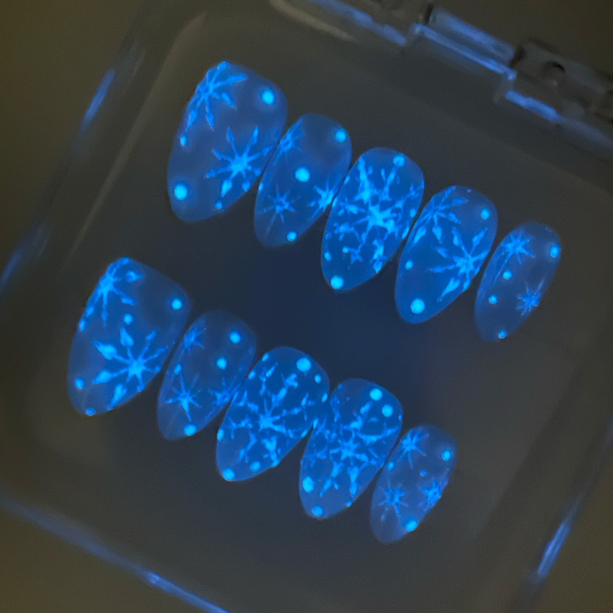 What truly sets these press-on nails apart is their mesmerizing glow-in-the-dark effect. When the lights go out, your nails transform into a luminous display, softly glowing like stars against a snowy night sky. This unique feature adds an element of mystery and allure, ensuring your nails remain captivating even in low light.