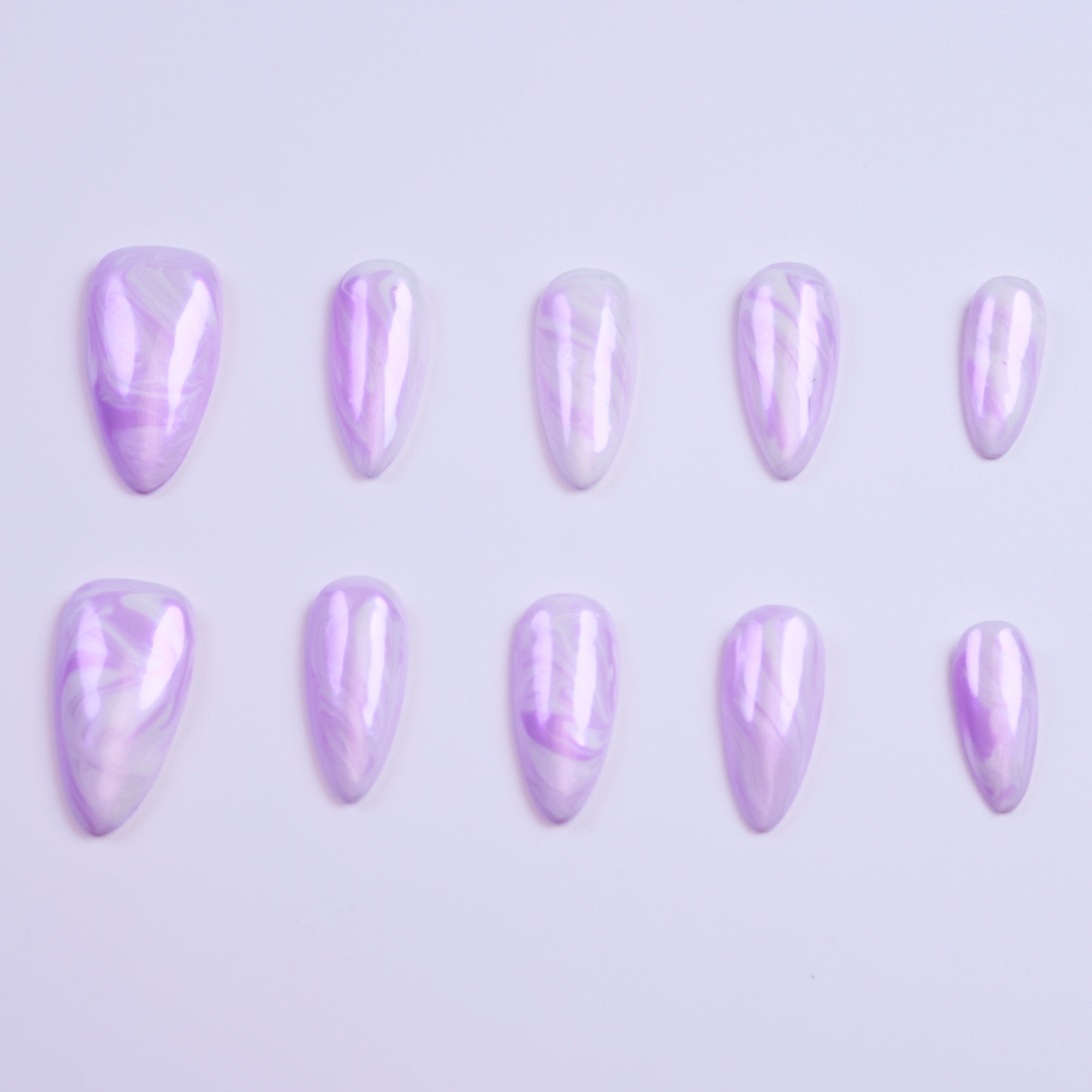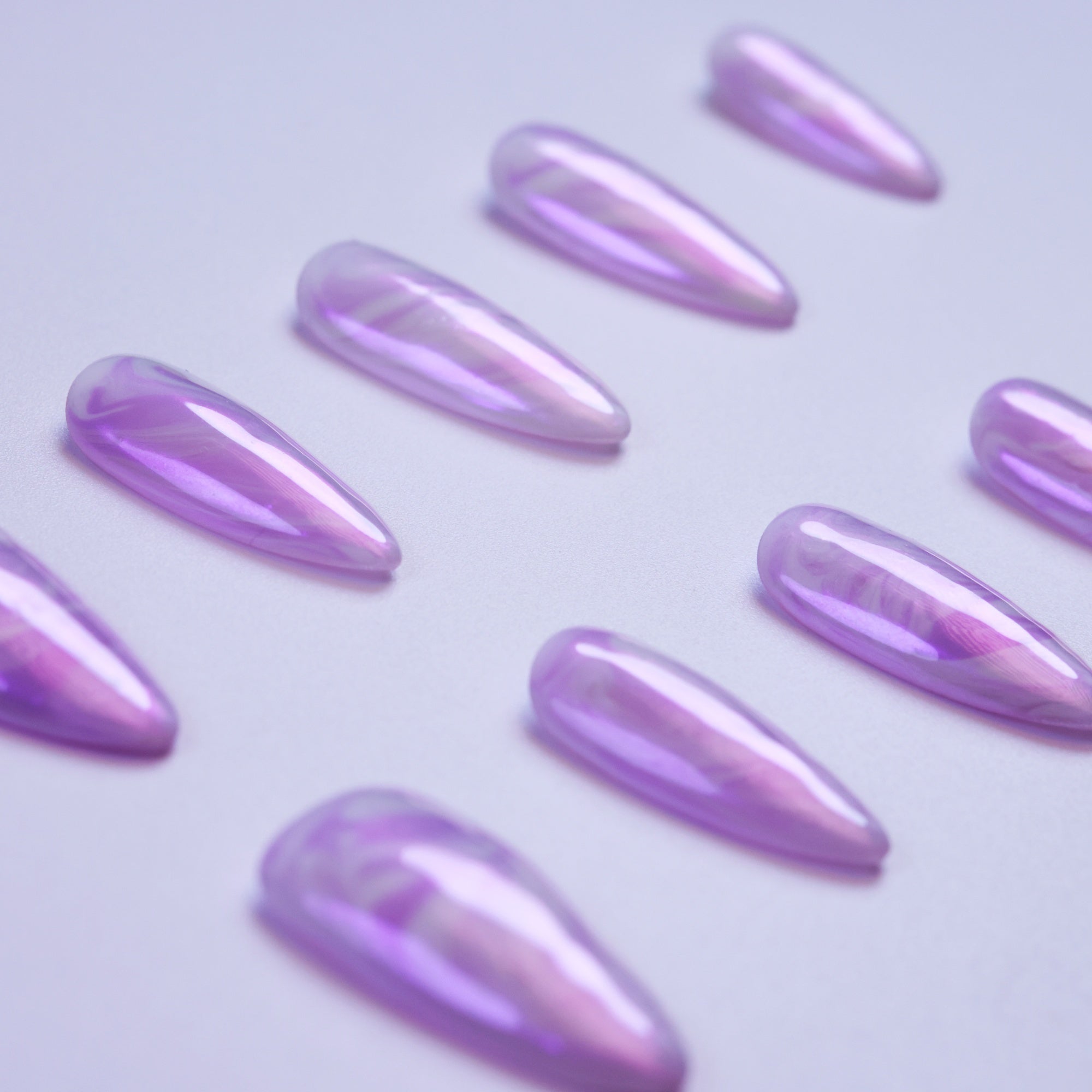 Step into a world of soft, shimmering beauty with the Opal Glow Press-On Nails. This stunning set features a delicate marble-like swirl of lilac and white, reminiscent of the natural glow and iridescence of opal gemstones. Perfect for adding a subtle yet captivating touch to your look, these nails exude elegance and charm.