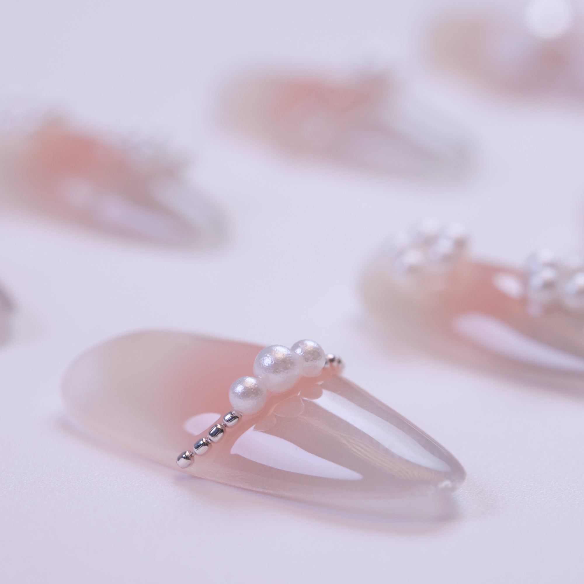 - Soft nude base with pearl and bow accents for a refined, elegant look