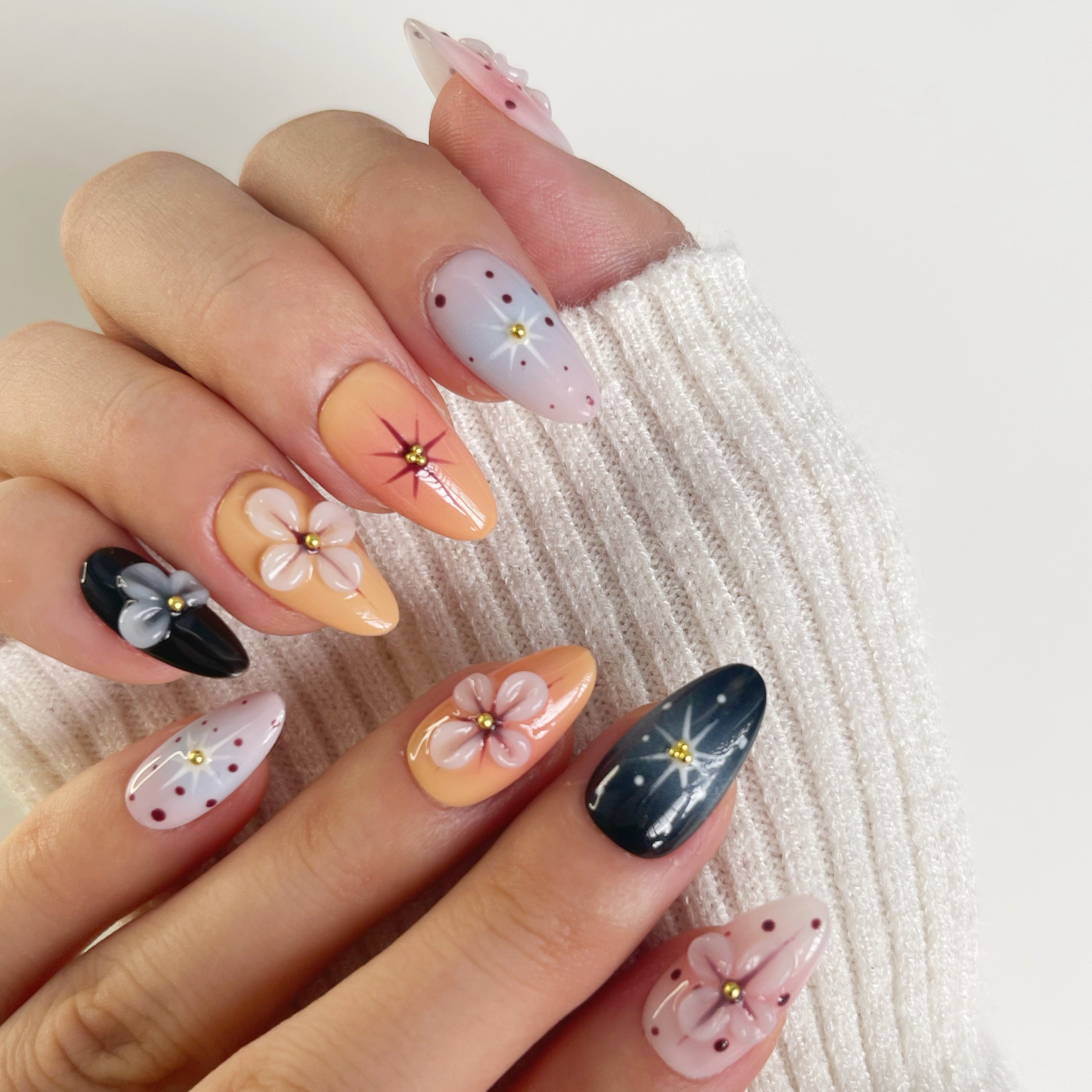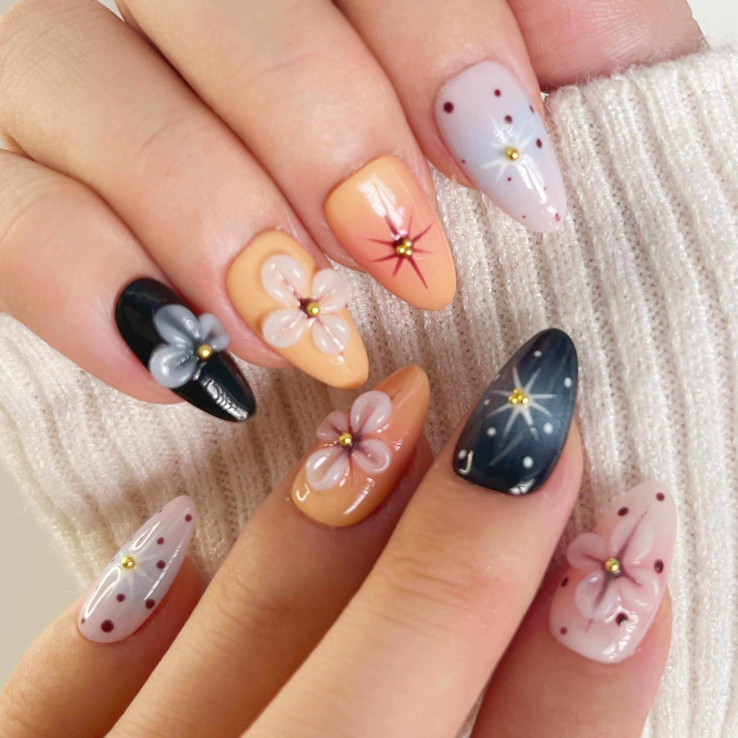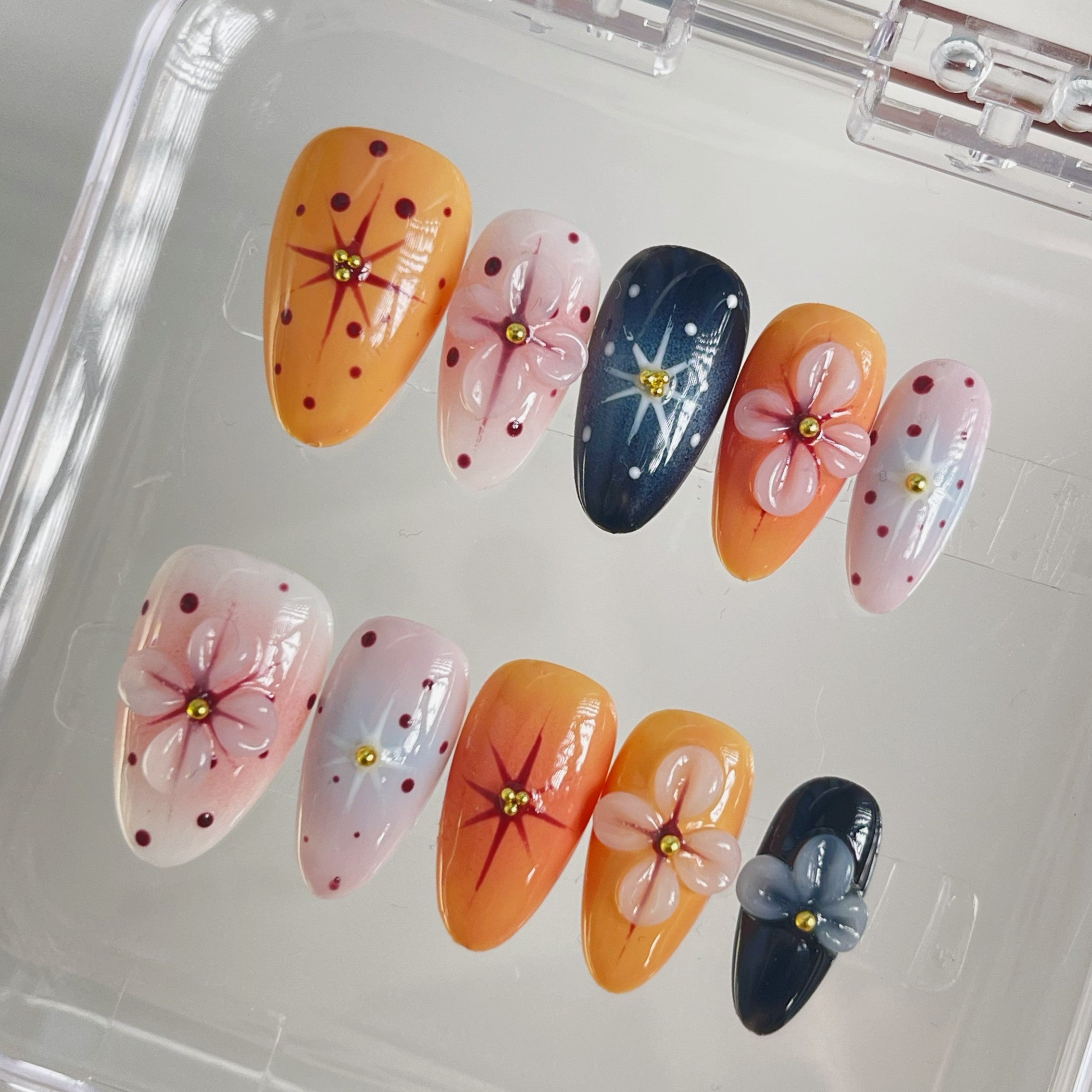 Capture the vibrant hues of autumn with Radiant Autumn Glow, a design that seamlessly blends warmth, charm, and elegance. Featuring vivid orange and deep navy tones, this set is adorned with delicate 3D floral embellishments, twinkling star patterns, and playful polka dots for a whimsical yet sophisticated look.