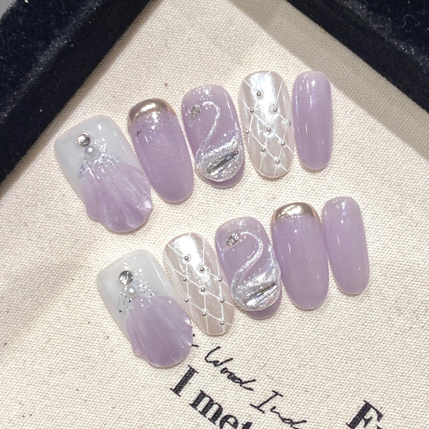 Step into the enchanting world of a ballet performance with the Swan Reverie Press-On Nails. A soft lavender hue interwoven with pristine white creates an ethereal look, while subtle shimmer and pearl accents hint at graceful sophistication. Delicate lace-like detailing and elegant swan motifs complete the dreamy design, adding a touch of refined femininity to every gesture.