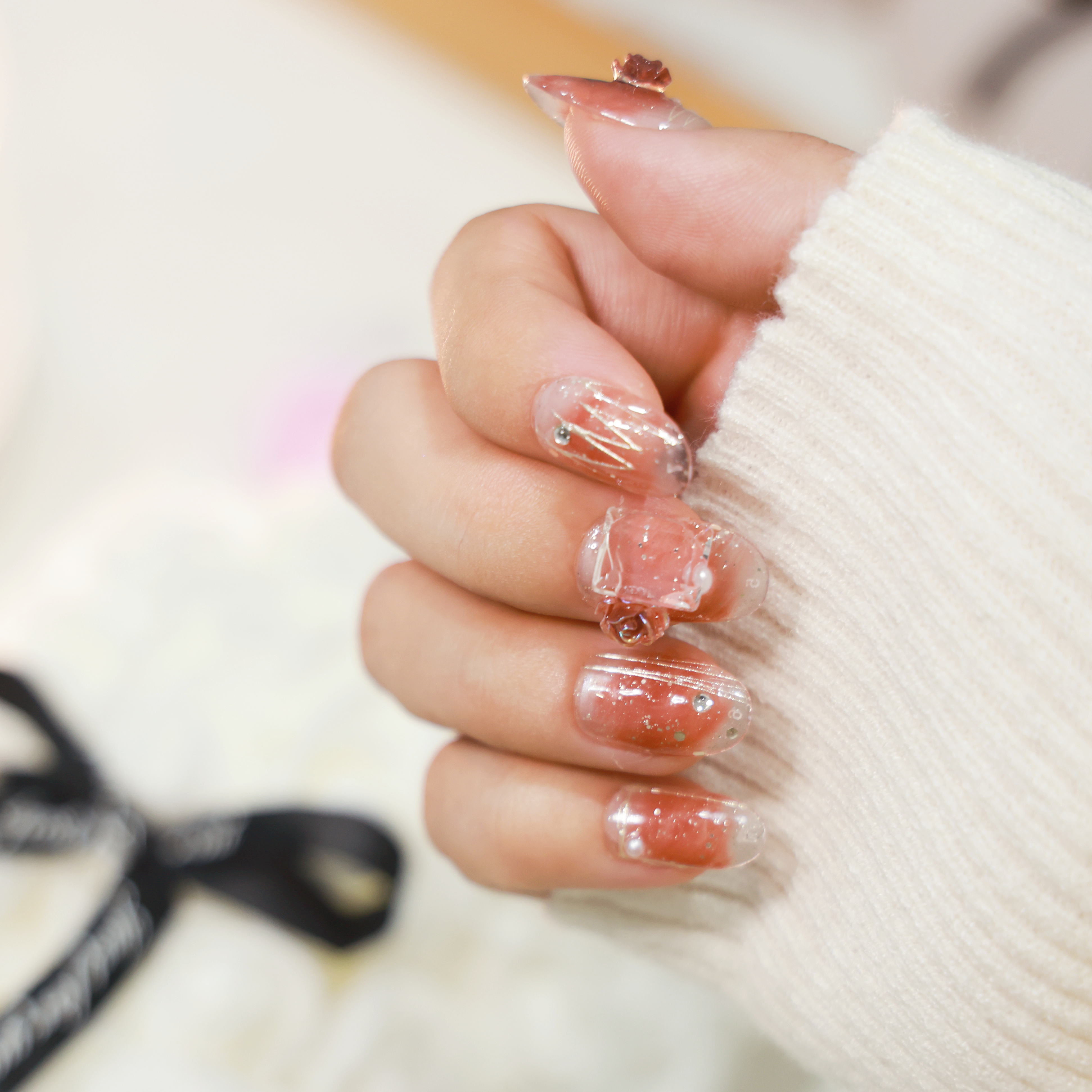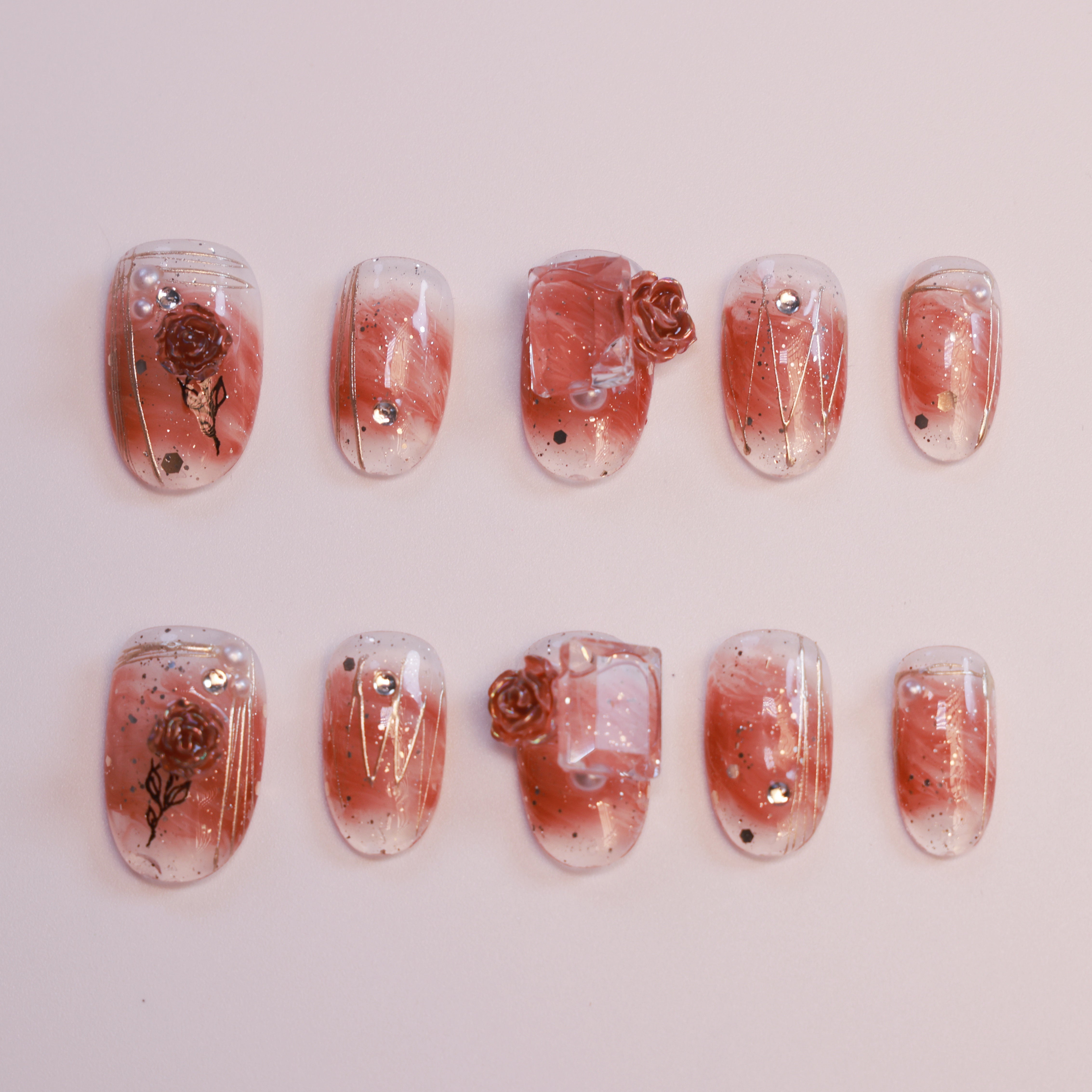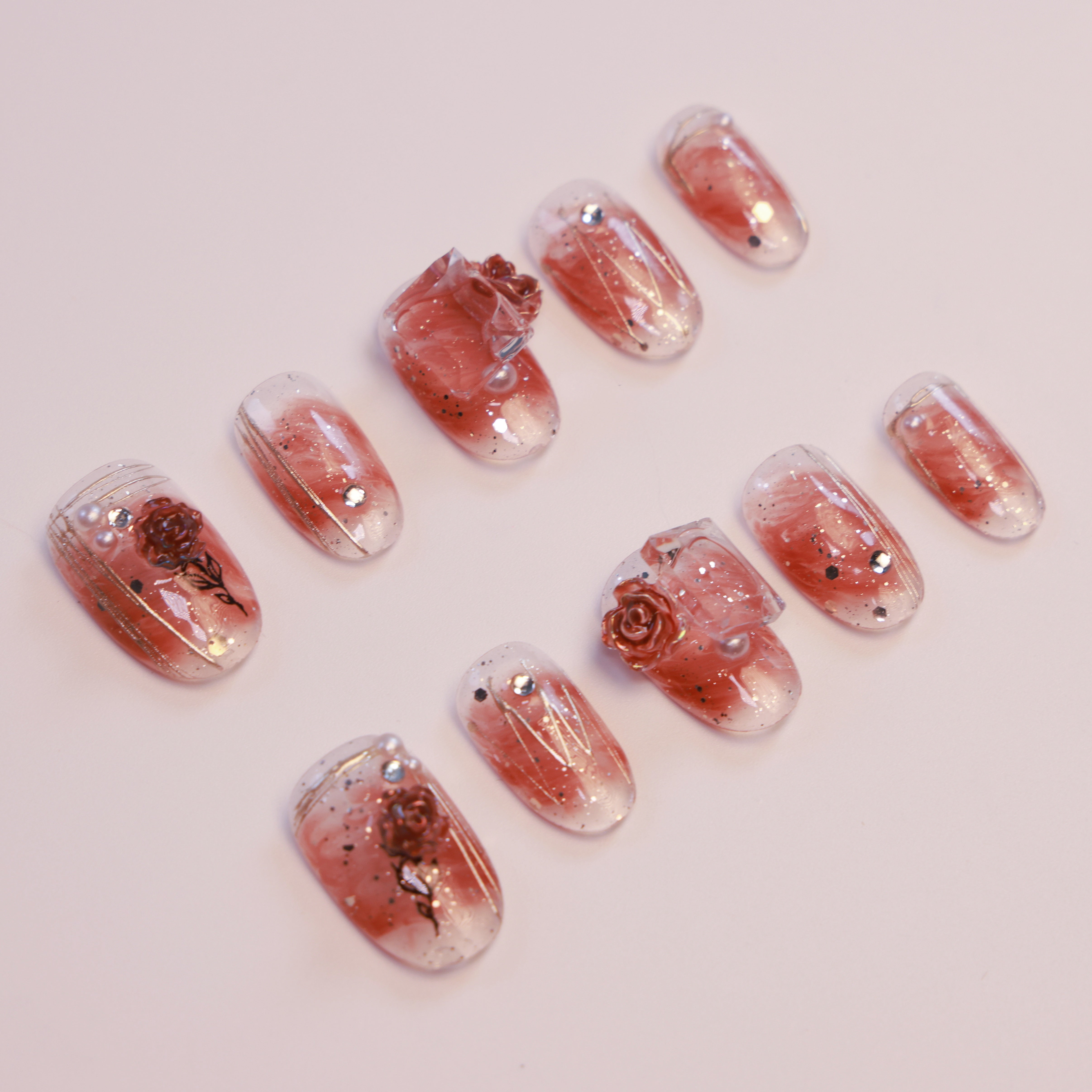 Each nail features a rich, red-brown gradient that mirrors the hues of a delicate rose in bloom. The design is further elevated with intricate gold detailing and sparkling embellishments, reminiscent of the enchanted rose encased in its glass dome. A stunning 3D rose charm adorns select nails, adding an elegant, tactile feature that sets this set apart from others.